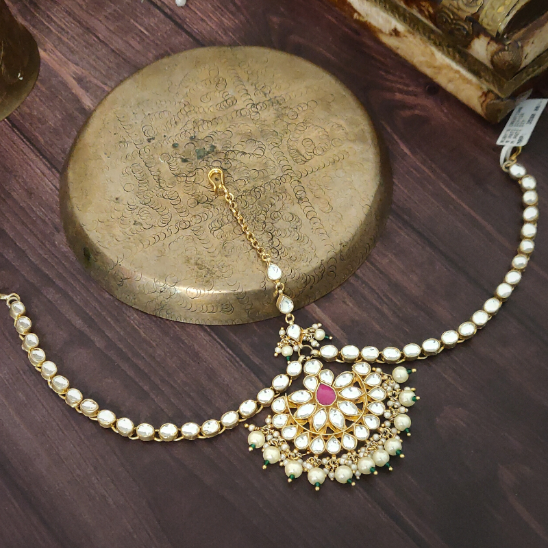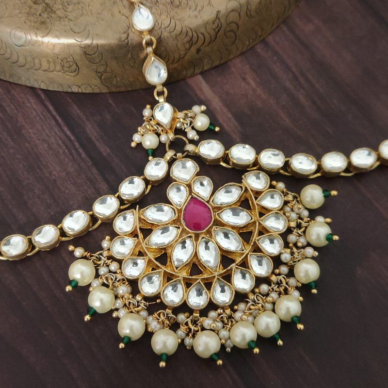 A mathpatti in paachi kundan with pearls is adorned with a maangtikka that has a Chaandbali shape.