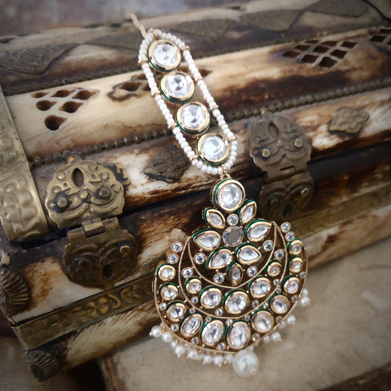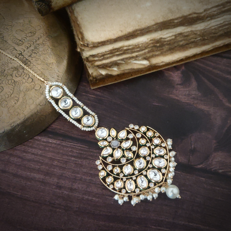 Crafted with the finest 18-karat gold plating, this maang tikka is adorned with stunning uncut artificial polki and intricate pearl beads. one of our best seller maang tikka