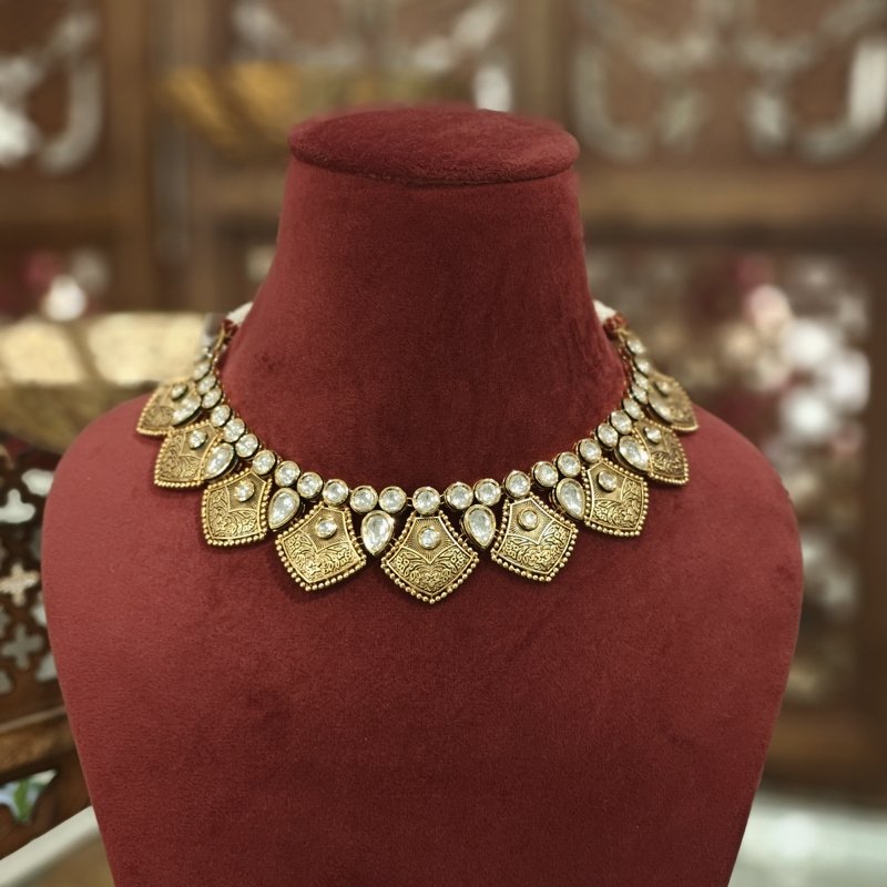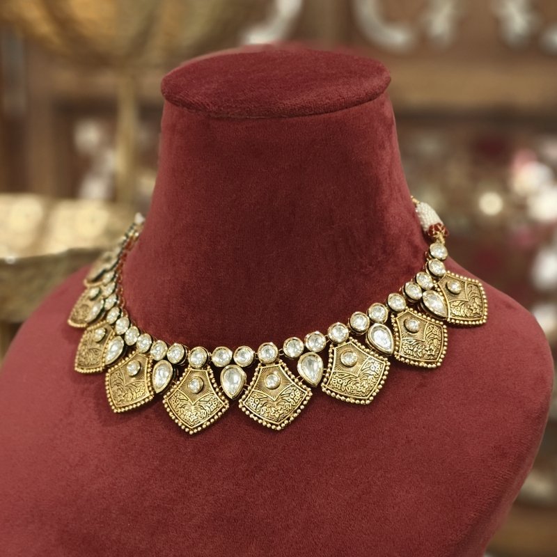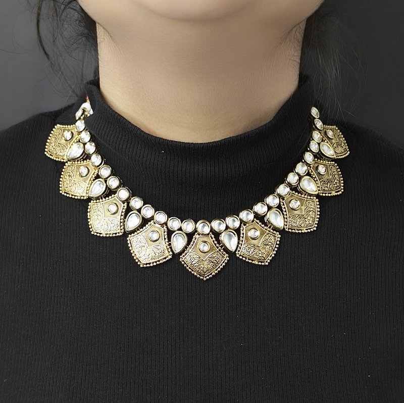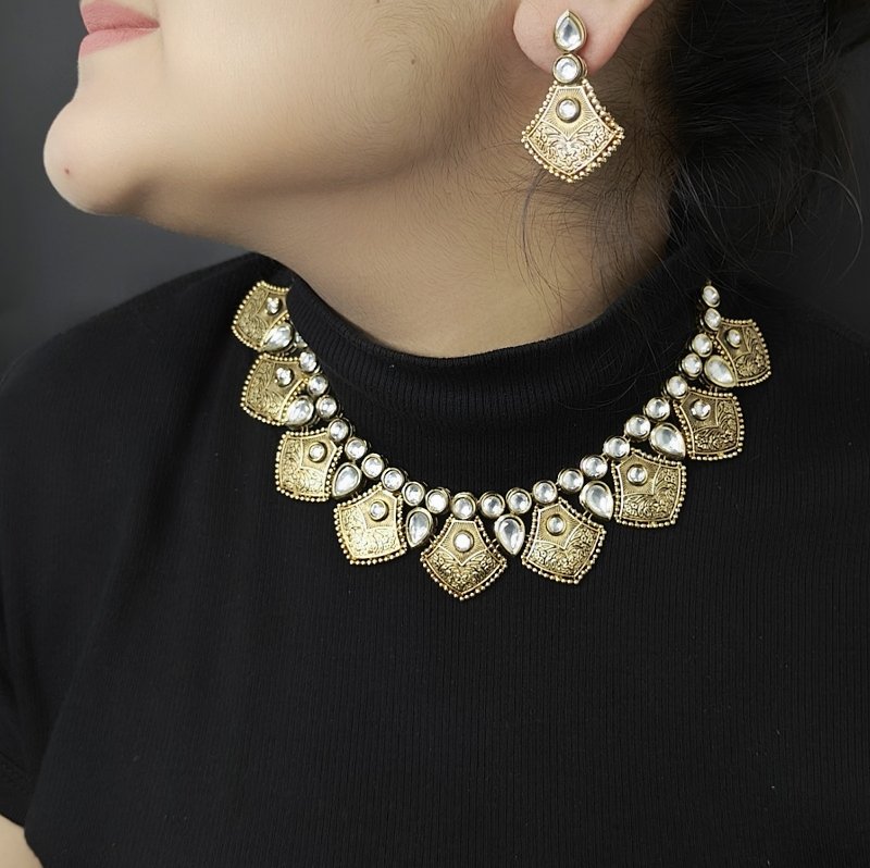 This elegant set features black enamel with antique gold plating, adorned with kundan and pearls. Its lightweight design makes it a perfect blend of beauty and comfort, offering a sophisticated touch to any ensemble.