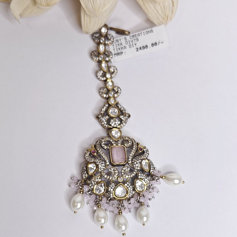 Anamika Moissanite polki Tikka is made using Uncut silver foil polki and cz stones . This tikka is beaded with emerald green drops and micro pearls .