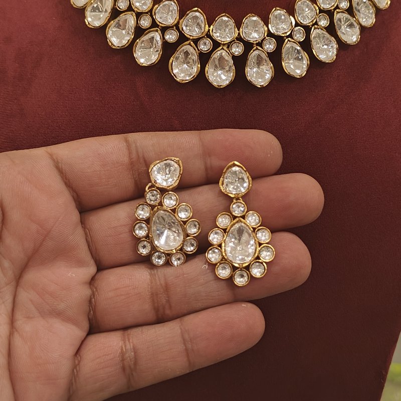 This necklace set is made of a mixed silver metal alloy with a 22 karat gold color coating.This set is embellished with lab-grown polkies that closely resemble genuine diamond stones.