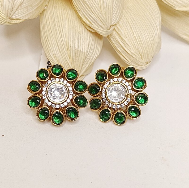 Small-sized studs featuring a central uncut polki stone surrounded by green hydro stones and bordered with cz stones .