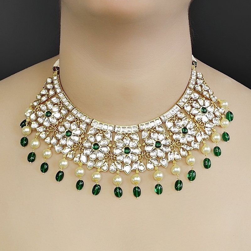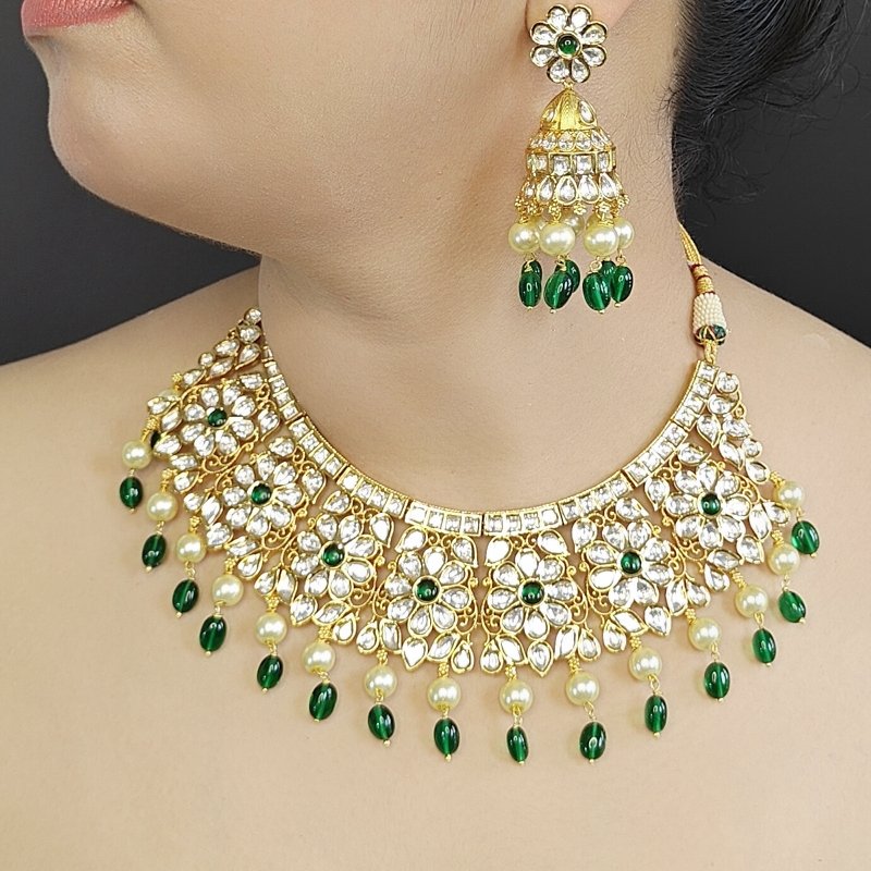 Crafted with immitation polkies and a striking ruby-hued center stone, this ensemble comes complete with exquisite jhumka earrings. Suspended from the base of the earrings, are shimmering ruby colored stones, adding a touch of glamour to the design.