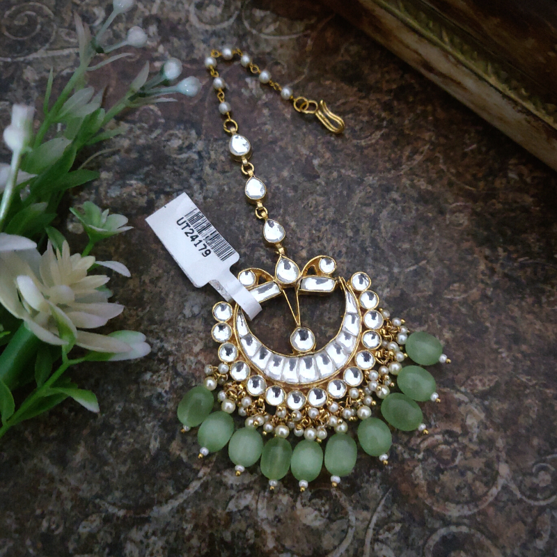 22 Kt Gold Plated Rakshita Maangtikka is made in Ahmedabadi Paachi kundan and beaded with Mint green two tone drops and White beads