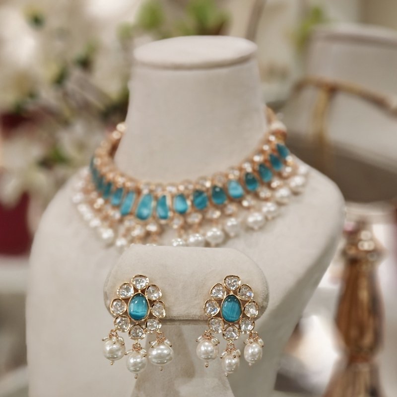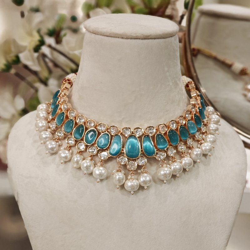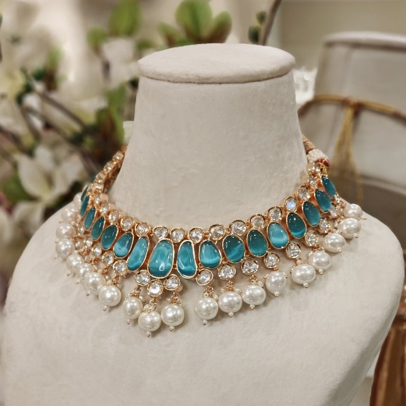 Stunning RANGOLI set crafted with uncut cz polki and beaded with oval pearl and studded with Aqua monalisa stones ,plated in 18 kt gold .
