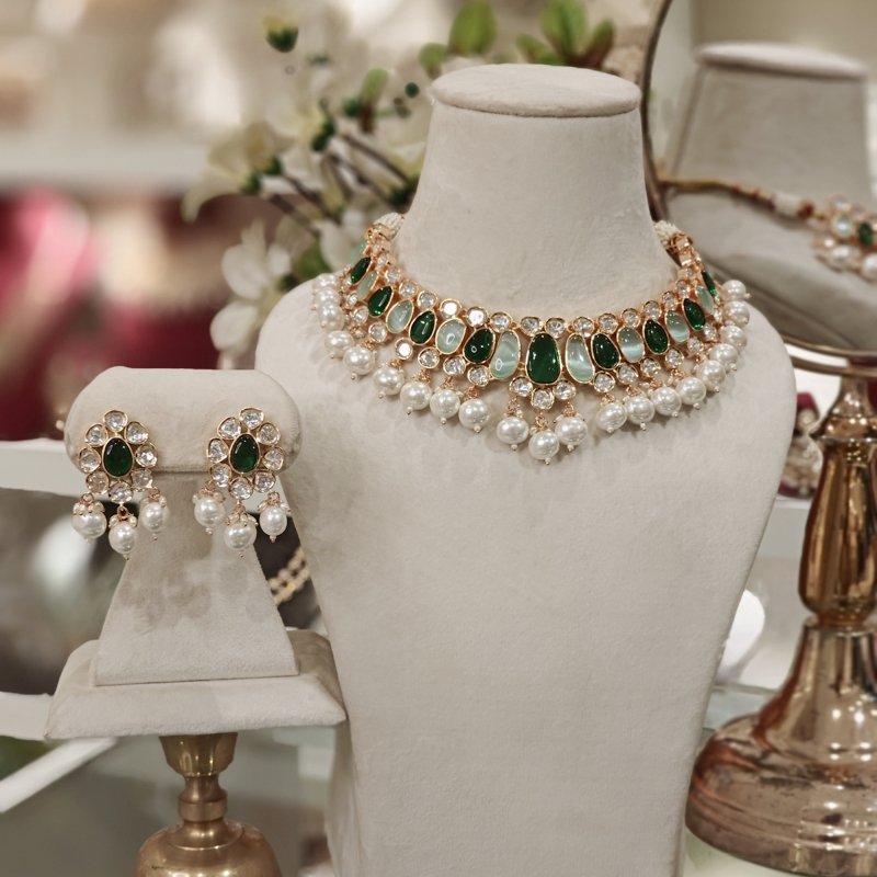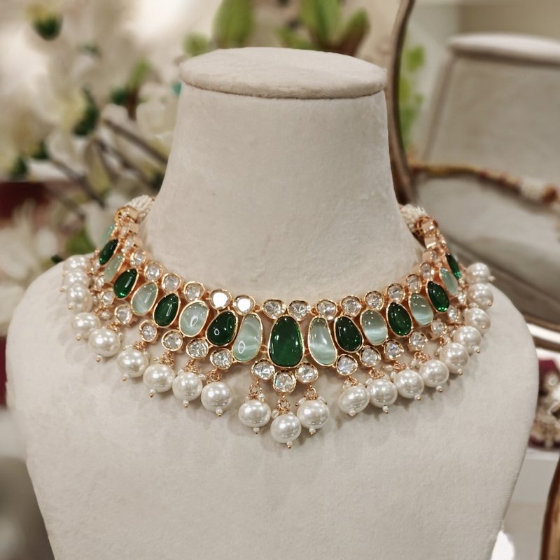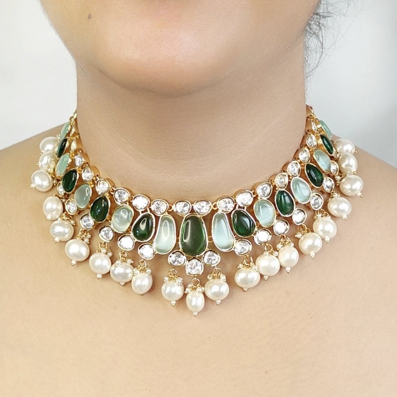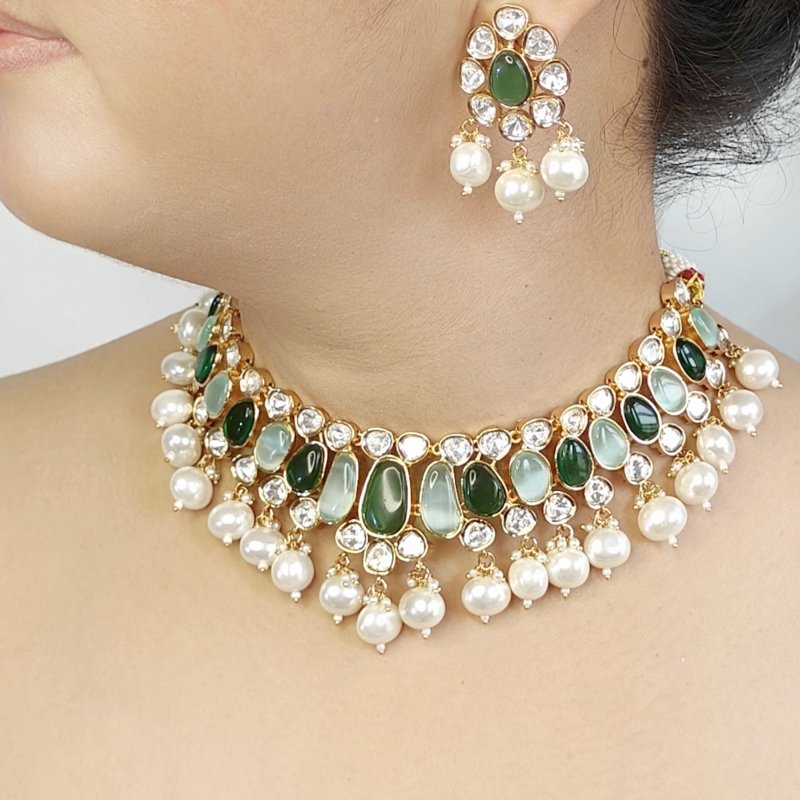 Stunning RANGOLI set crafted with uncut cz polki and beaded with oval pearl and studded with two tone Green monalisa stones ,plated in 18 kt gold .