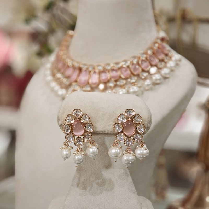 Stunning rangoli set crafted with uncut cz polki and beaded with oval pearl and studded with Pink monalisa stones ,plated in 18 kt gold .