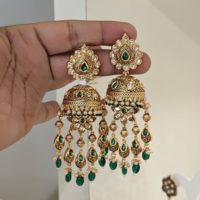 These exquisite jhumkas are crafted in antique gold, featuring intricate filigree work and studded with sparkling green pota stones. Perfect for adding a touch of timeless elegance to any occasion, these earrings embody classic beauty and luxurious craftsmanship.