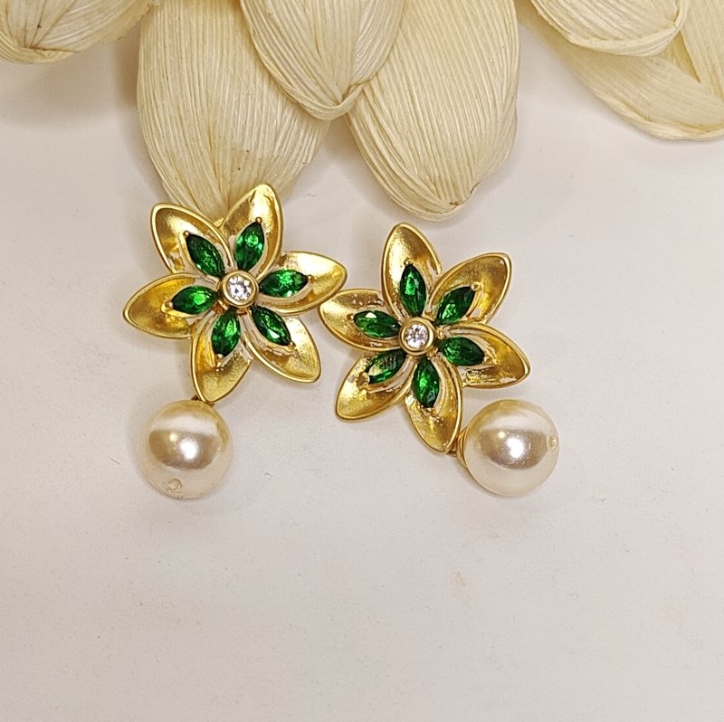 These 22 kt matte gold-plated earrings are designed in a sunflower motif, featuring emerald green marquise stones and a dangling pearl at the bottom.