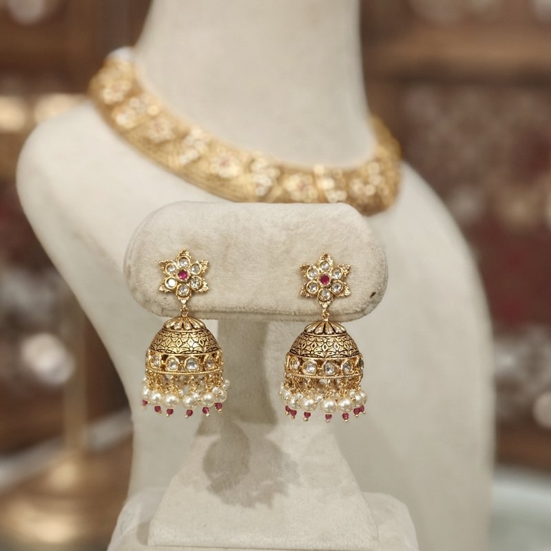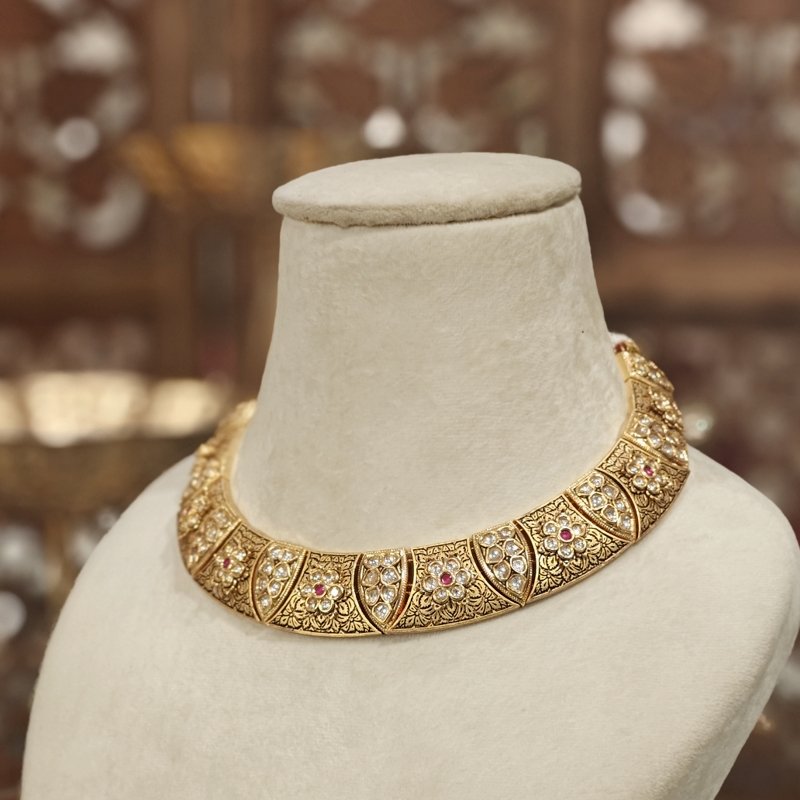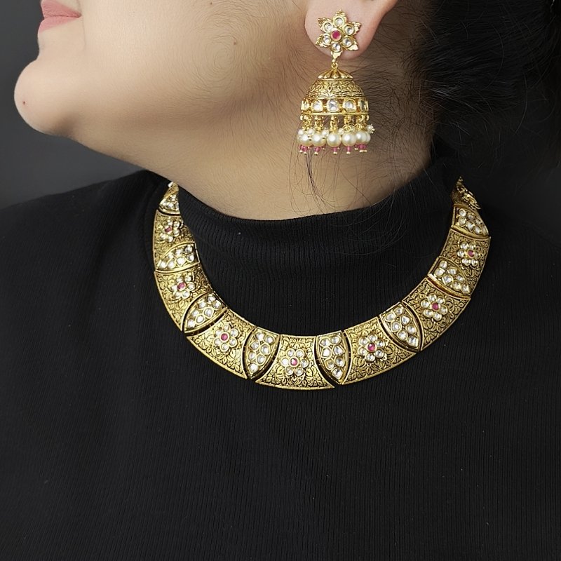 This elegant set features half dome hansali style, black enamel with antique gold plating, adorned with kundan and pearls. Its lightweight design makes it a perfect blend of beauty and comfort, offering a sophisticated touch to any ensemble.