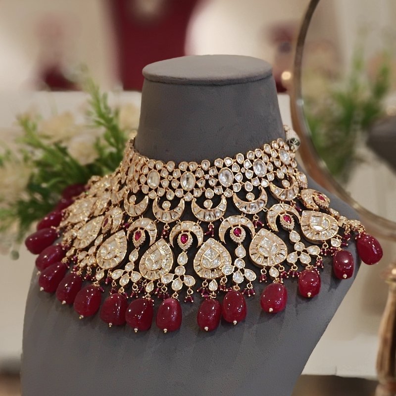 A set of choker and earrings, perfect for brides, has been created using striking ruby red and clear polki stones, paired with lengthy dangling earrings. The set is embellished with large-sized tumble stones of ruby red, adding to its overall charm.