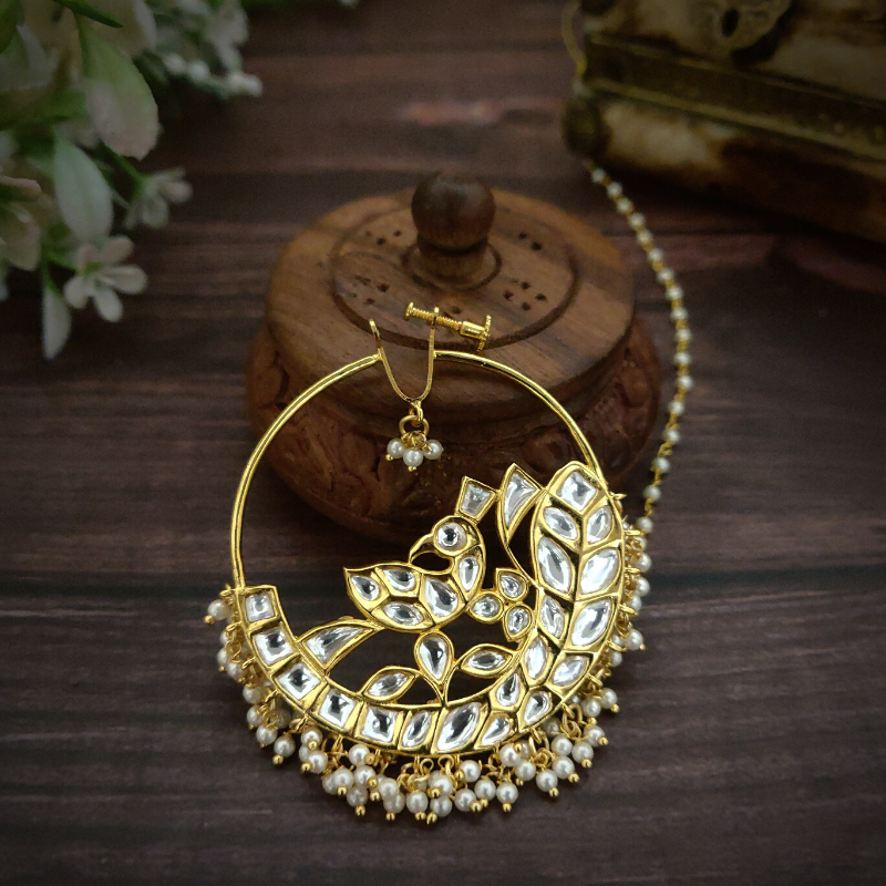 22 kt Gold Plated Razia Nath is made with uncut artificial polki stones and is decorated with a white pearl beads at the bottom .