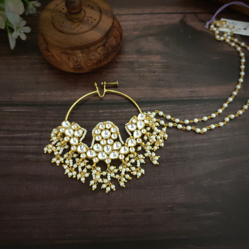 22 kt Gold Plated Reema Nath, made in Ahmedabadi Paachi kundan and beaded with white pearls .This Nath is for Non Pierced Nose.