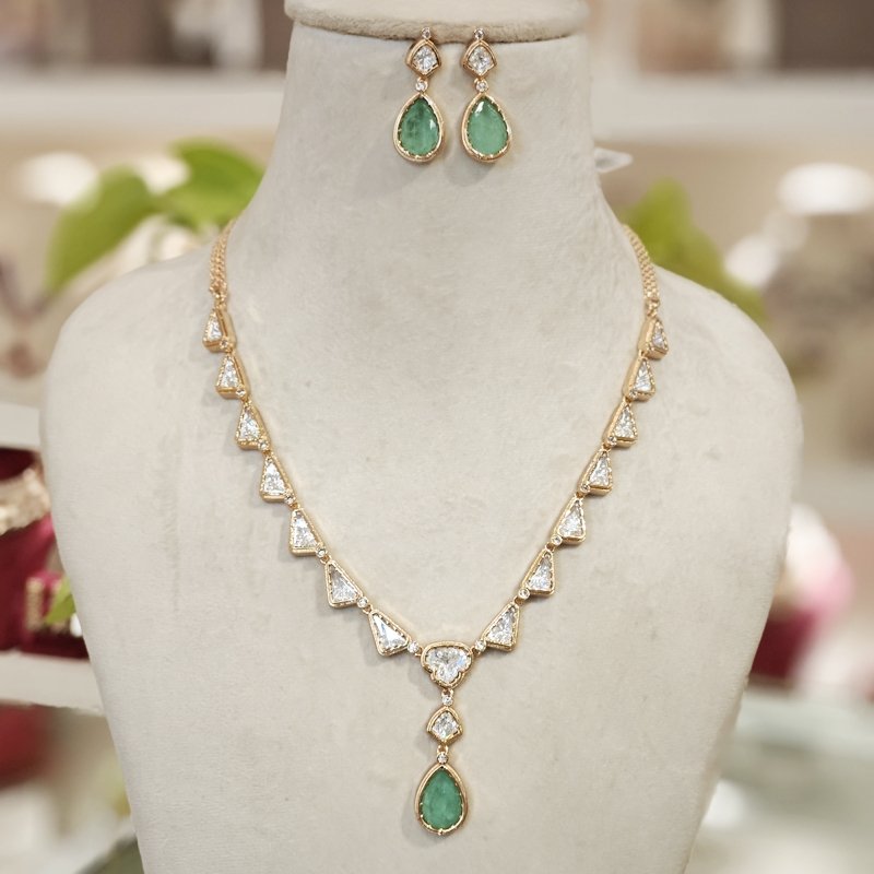 This stunning uncut Polki pendant set features a mid-length design, elegantly paired with matching earrings. The pieces are beautifully studded with mint green stone and sparkling cubic zirconia (CZ), creating a perfect blend of traditional and contemporary charm.