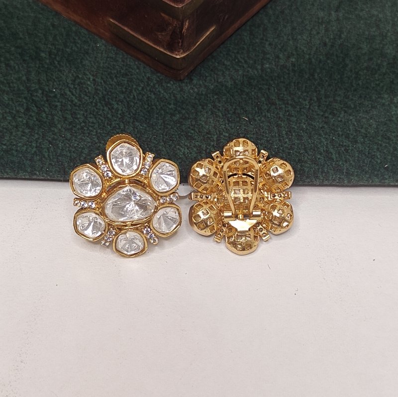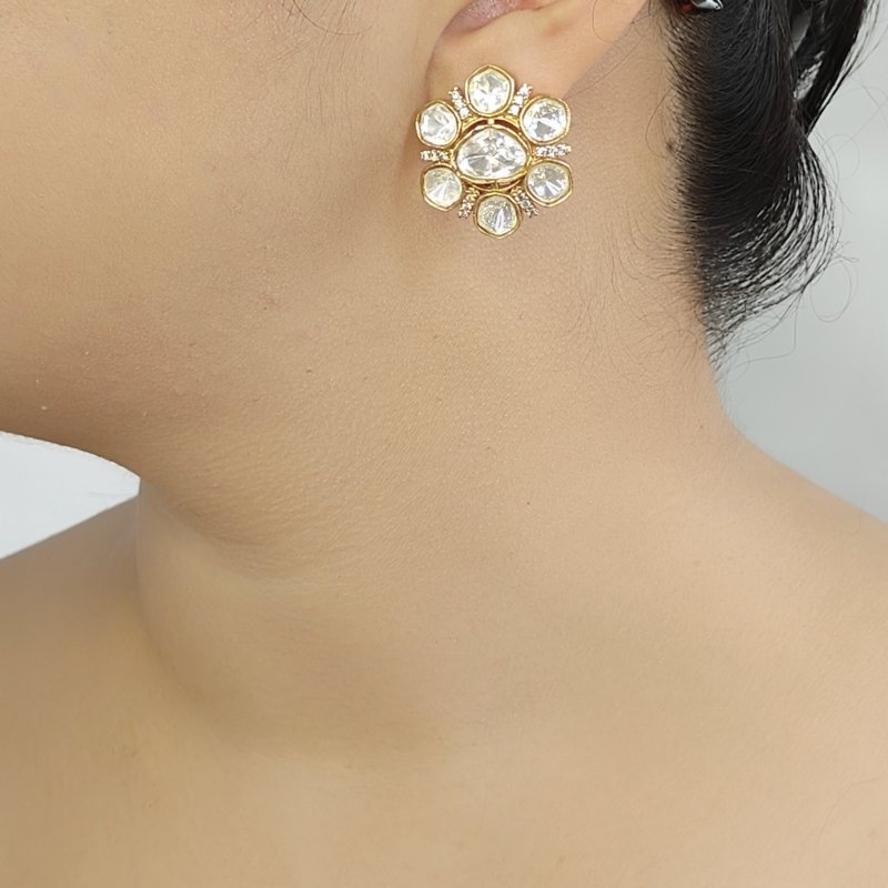 Finest quality deep cut moissanite polki studs plated in 22 kt gold colour to give rich and statement look to this pair of stud.