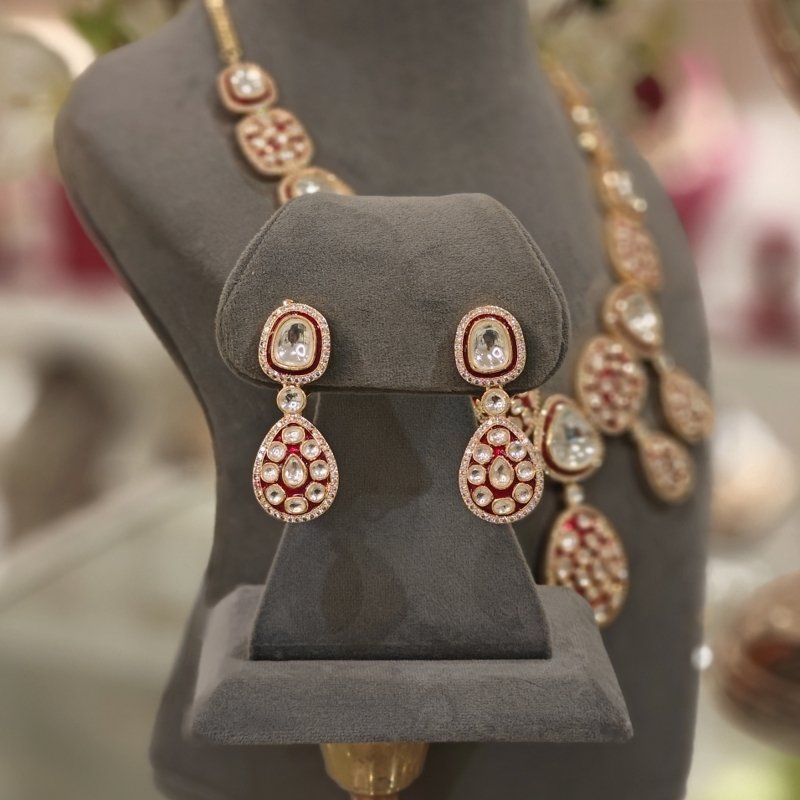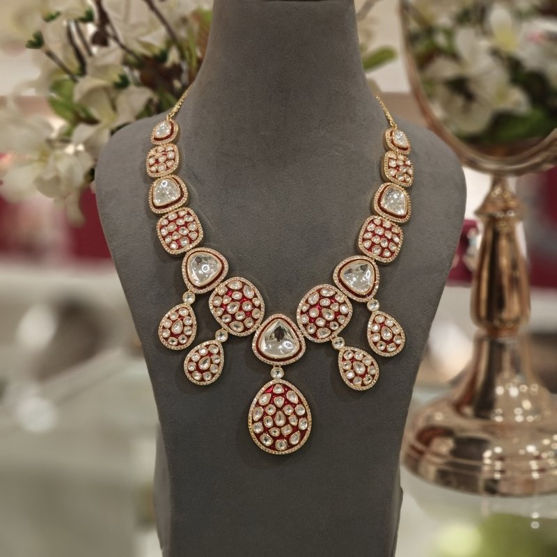 Gorgeous mid length necklace set in red minakari work and crafted with unrounds polki stones . This set is plated in 22 kt gold plating and earrings comes with bombay clasp at the back .