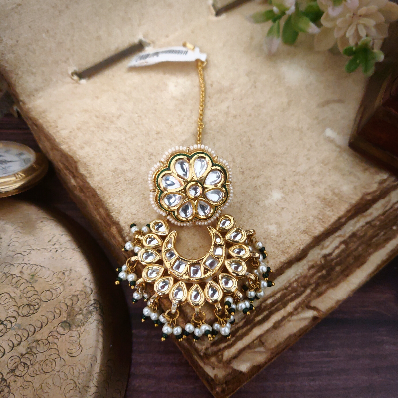 The exquisite Borla-style maangtikka in 22 kt gold plating is a masterpiece crafted with Polki stones and pearls. Indulge in the Rajasthani allure with this splendid ornament.