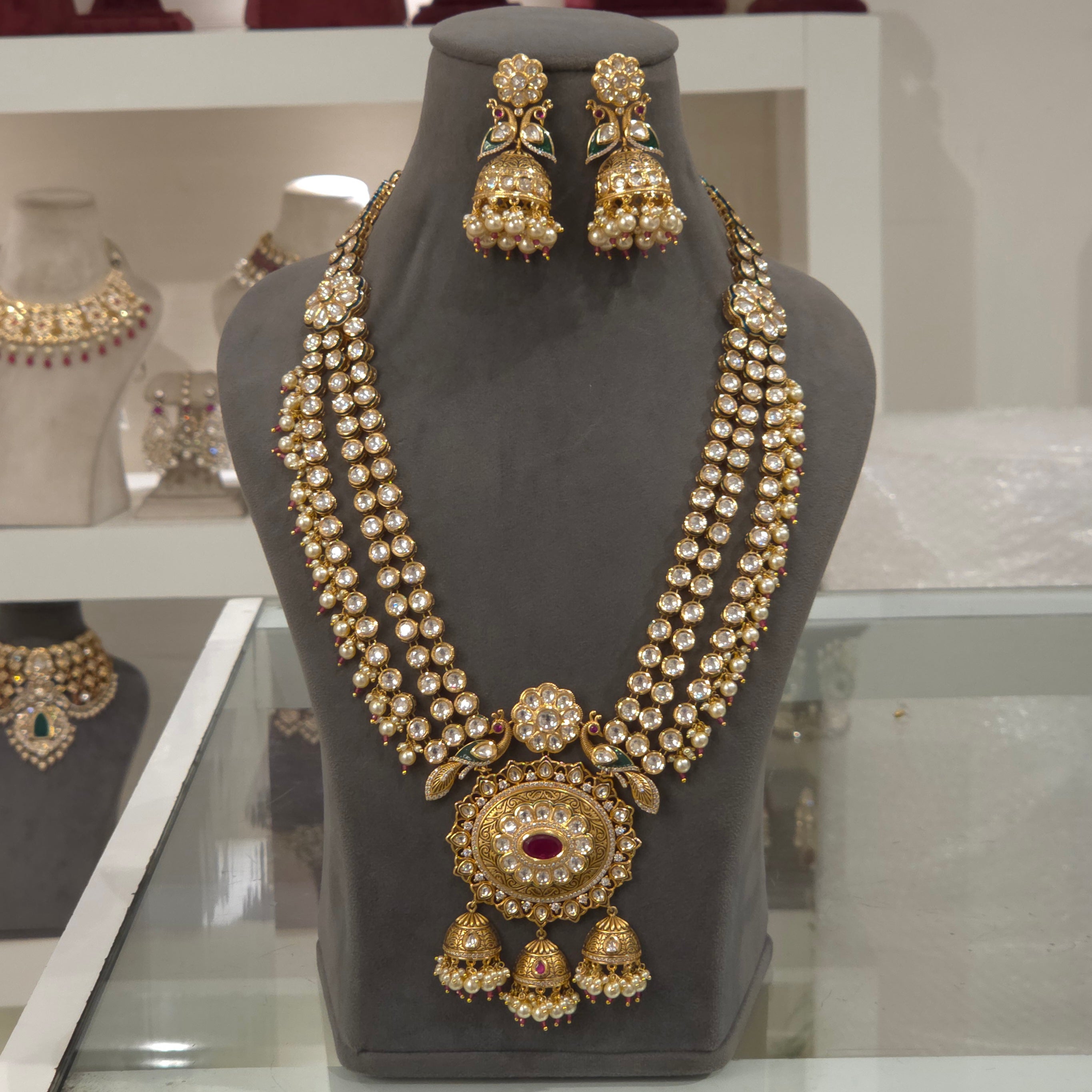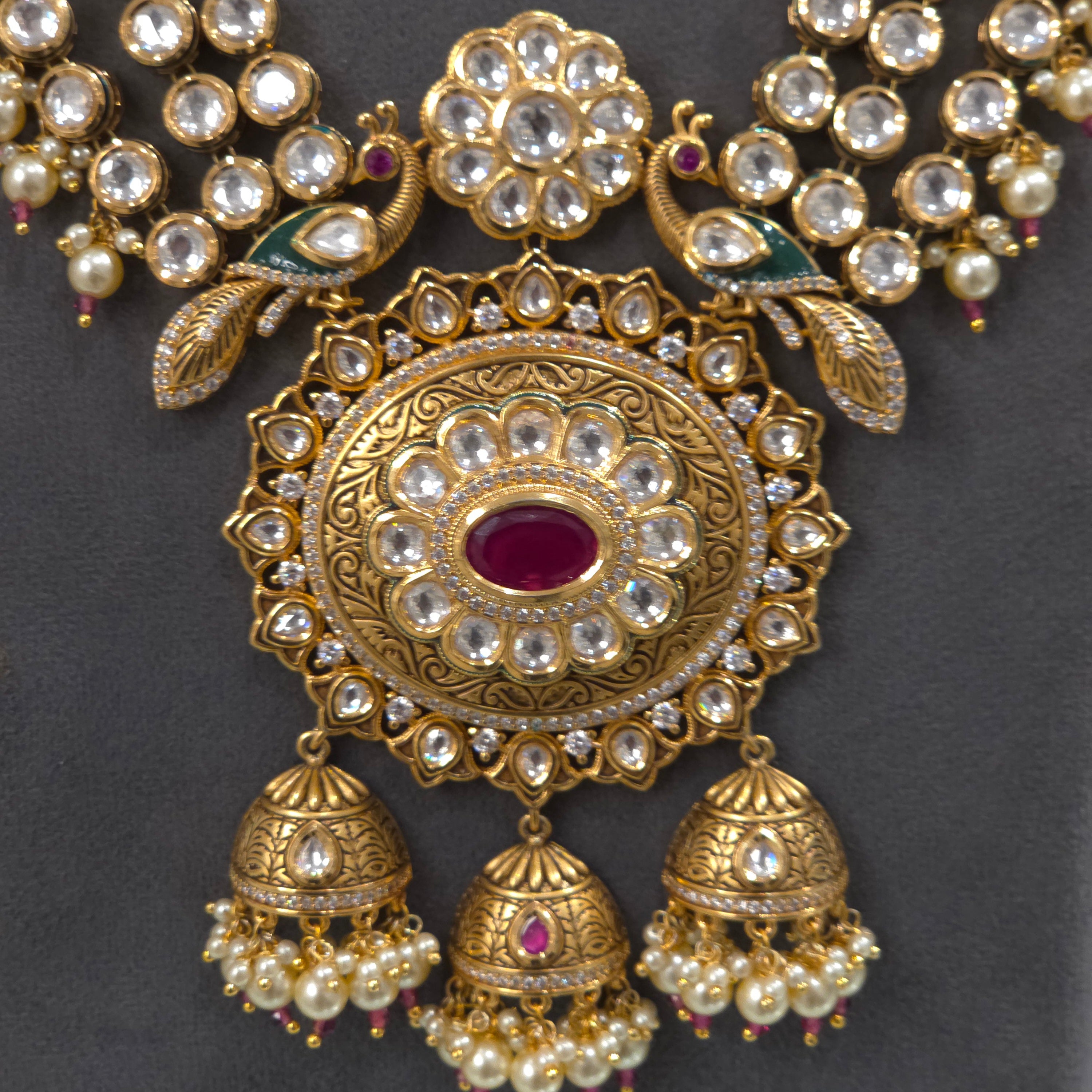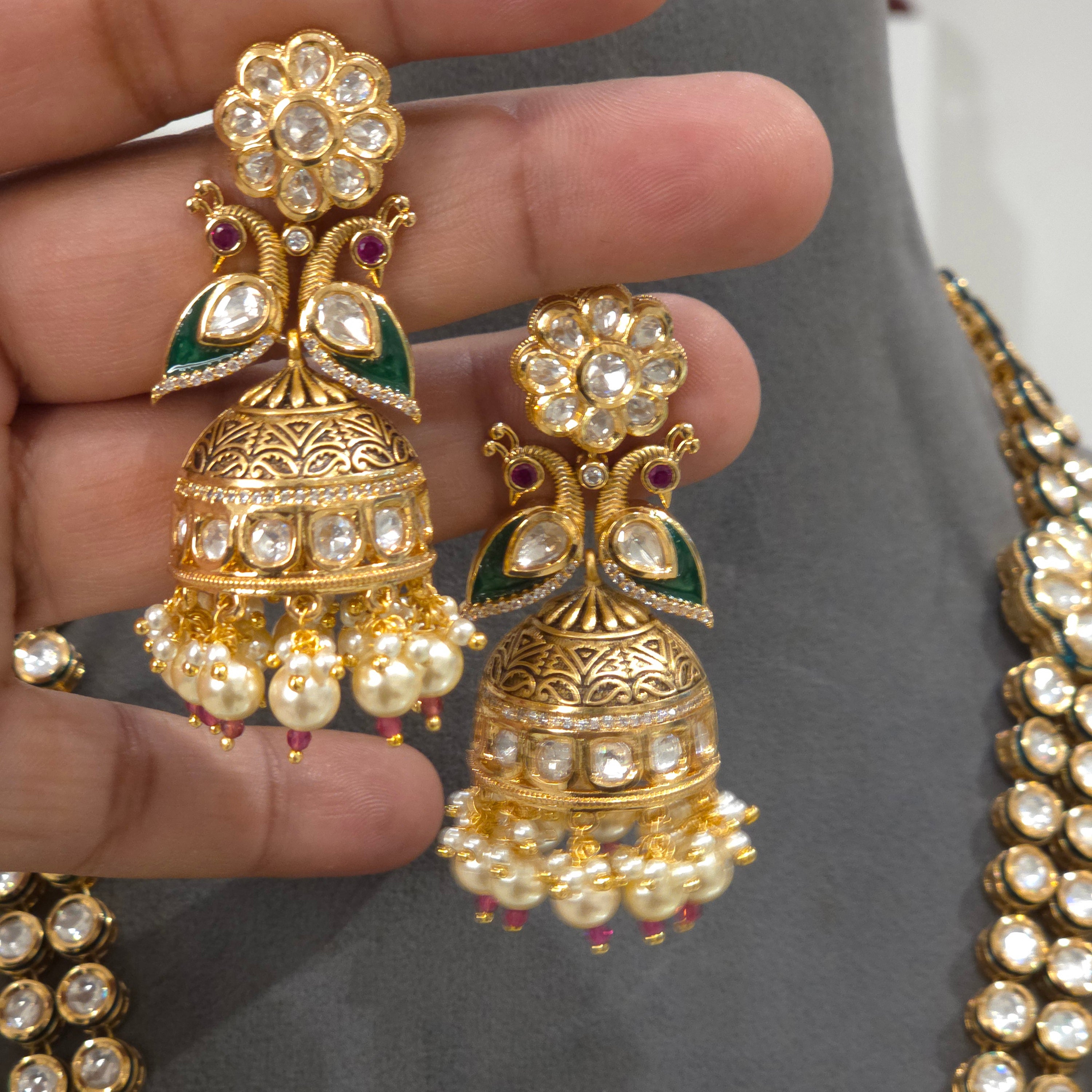 The Meenakshi kundan polki antique set features a meticulously crafted rani haar made from a brass mixed metal alloy, plated with 22 kt antique gold colour . It is enhanced by kundan polki stones and includes intricate peacock-shaped designs complemented by green meenawork, providing an elegant and culturally rich accessory.