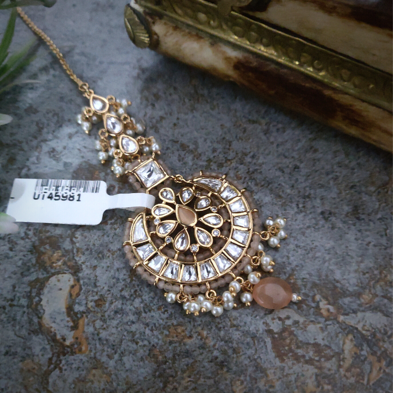 18 Kt Gold Plated Revathi Maangtikka, Made in uncut Artificial Polki and beaded with Peach coloured hydro and Monalisa stones with White Pearls.
