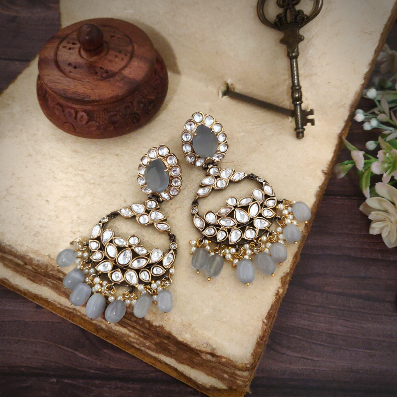 Victorian polished Indo Western Ria chaandbali ,studded with Artificial polki and beaded with white pearls and grey Monalisa beads .