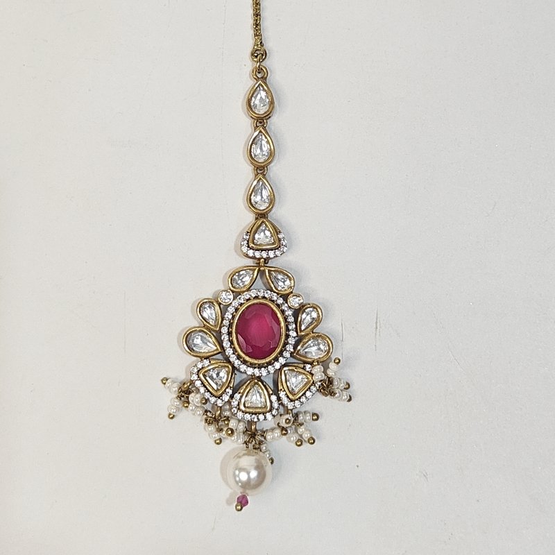 A stunning maangtikka featuring fusion of cz and polki gems , studded with ruby red stone and plated in gold and black rhodium .