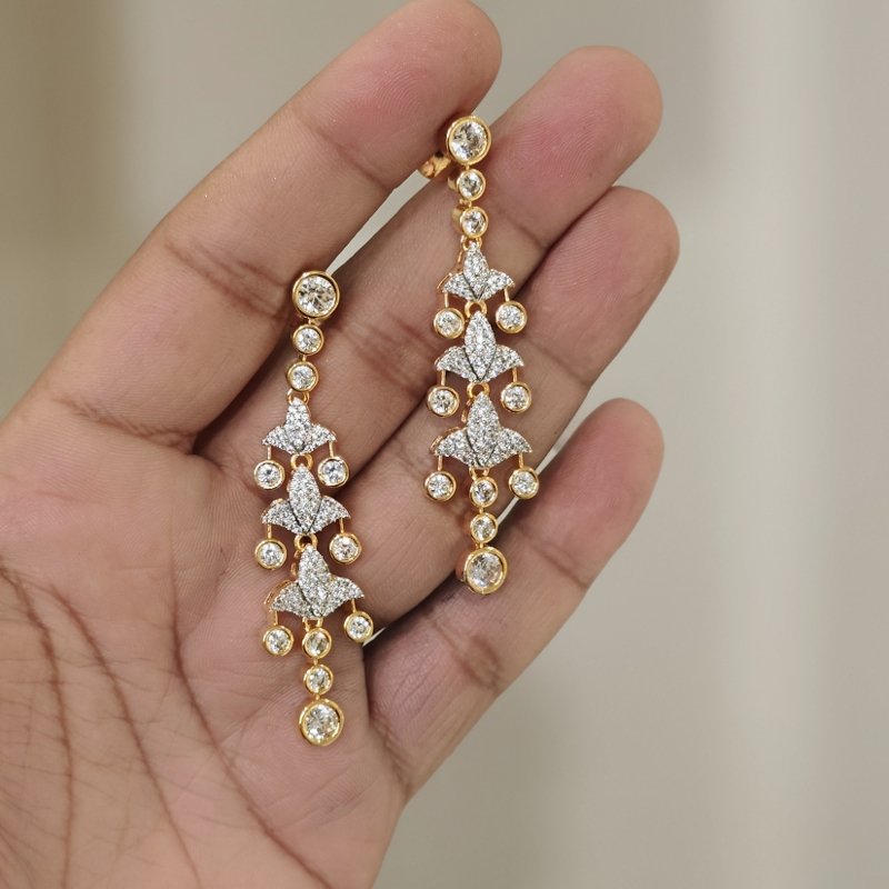 These long dangler earrings are studded with cz stones in close setting giving it a solitare look and plated in rose gold colour .