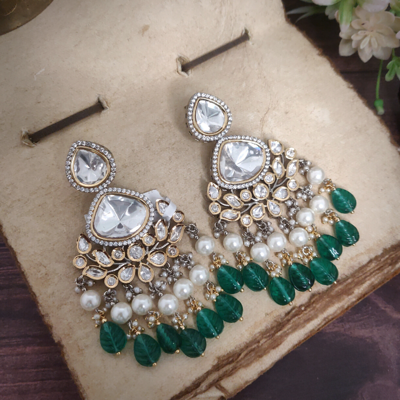 Victorian polished Indo Western Ridhima chaandbali ,studded with Artificial polki and beaded with white pearls and green melon beads .