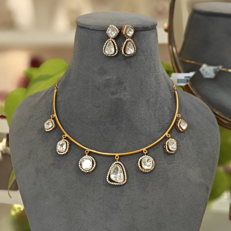 A necklace set designed with uncut moissanite Polki gems that are larger in size, surrounded by small CZ stones arranged in a micro pave setting and beaded jn gold plated neckline .