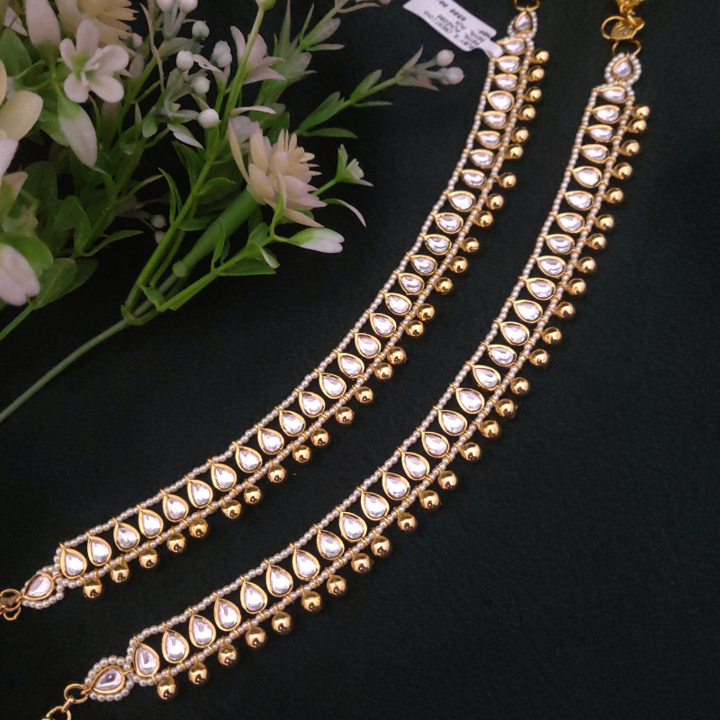 This gorgeous payal is embellished with delicate micro pearls and golden beads, all hand-beaded onto a base of pear shaped stunning polki. The luxurious piece is finished with a lustrous 22kt gold plating.