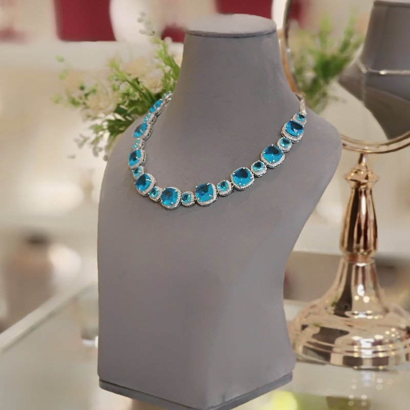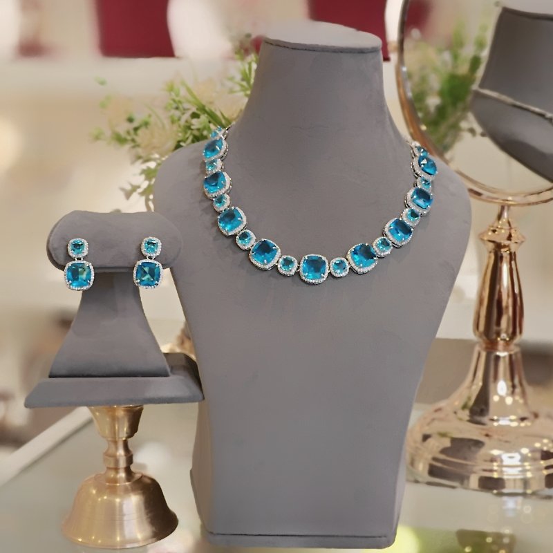A necklace set featuring aqua faceted hydro stone, cubic zirconia and white rhodium plating.