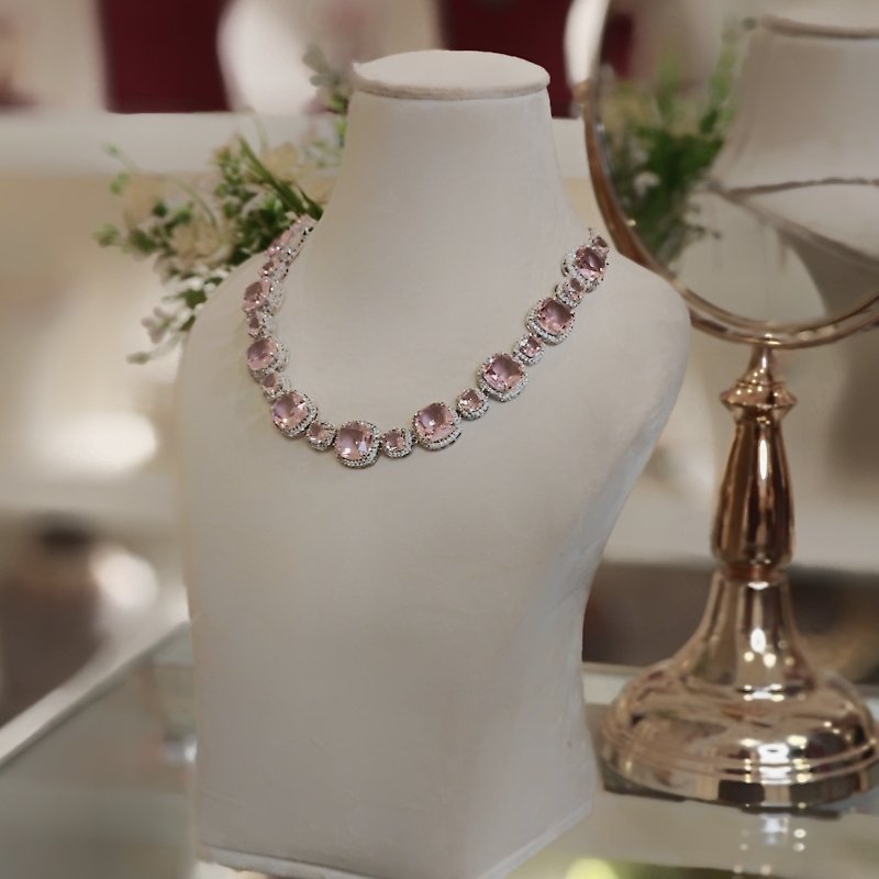 A necklace set featuring pink faceted hydro stone, cubic zirconia and white rhodium plating.