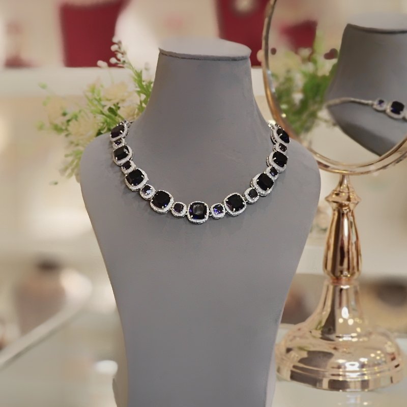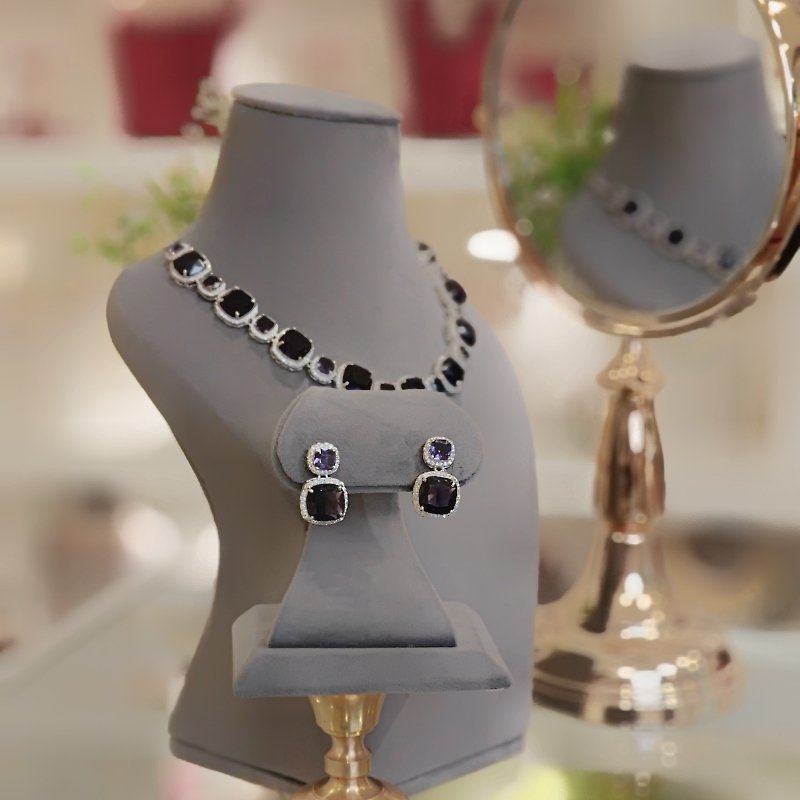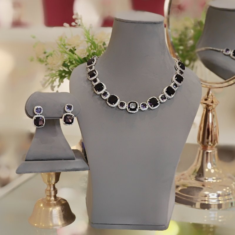 A necklace set featuring Purple faceted hydro stone, cubic zirconia and white rhodium plating.