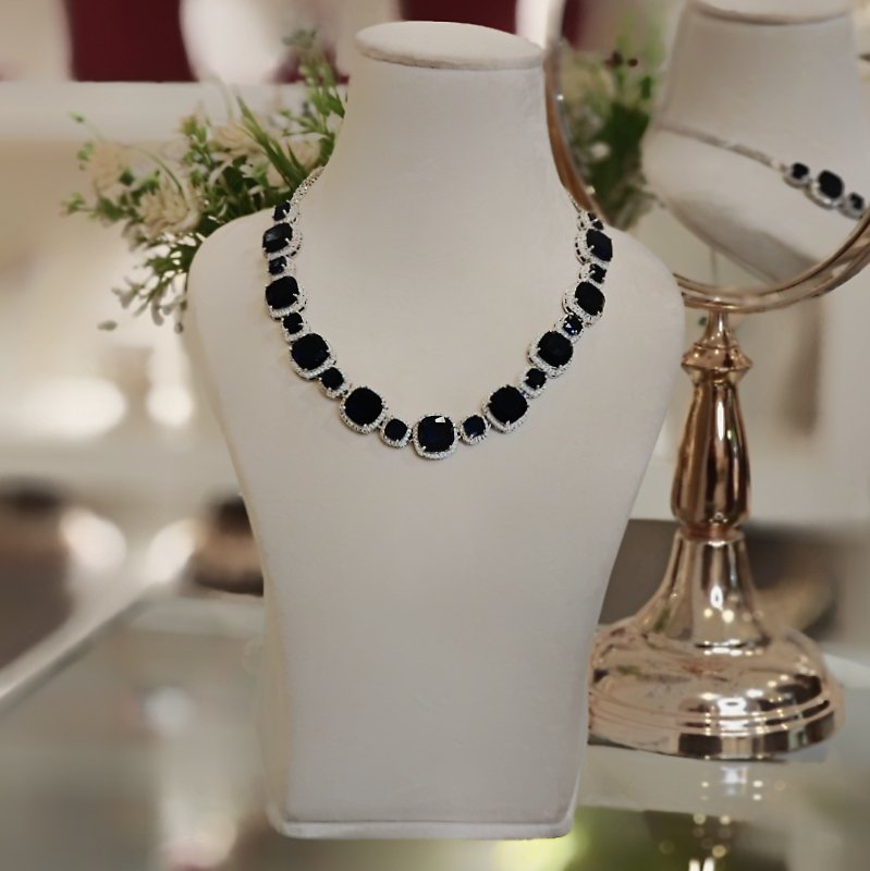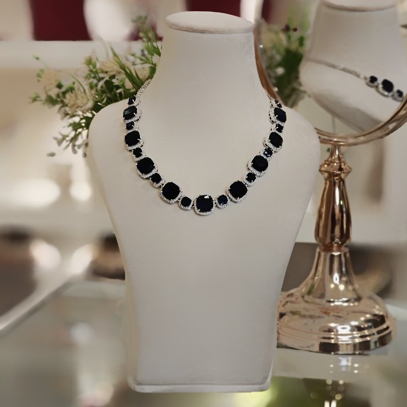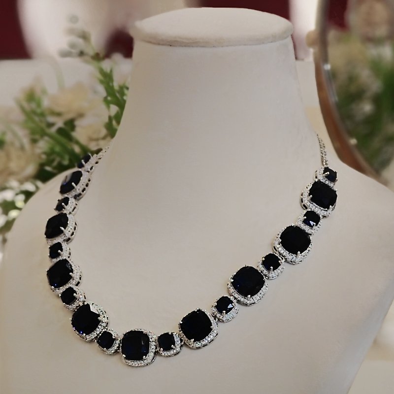 A necklace set featuring Royal blue faceted hydro stone, cubic zirconia and white rhodium plating.