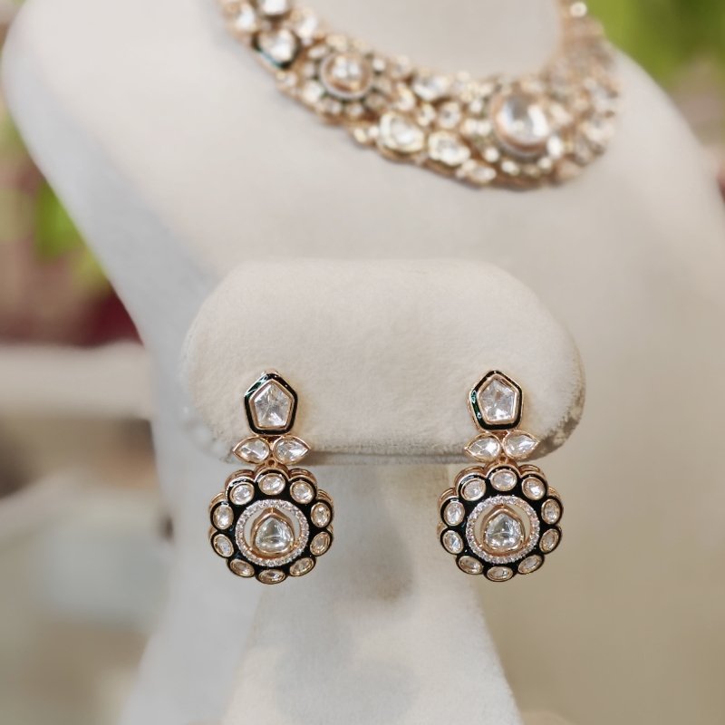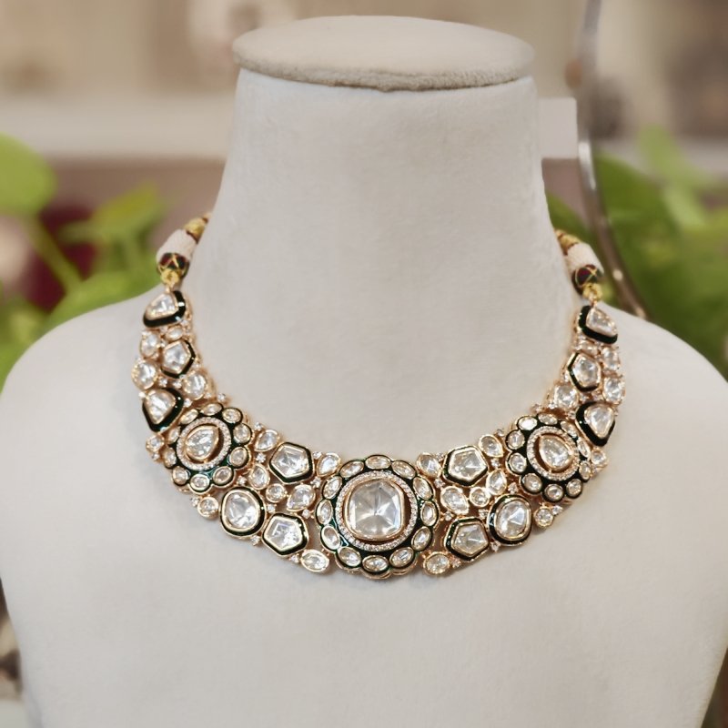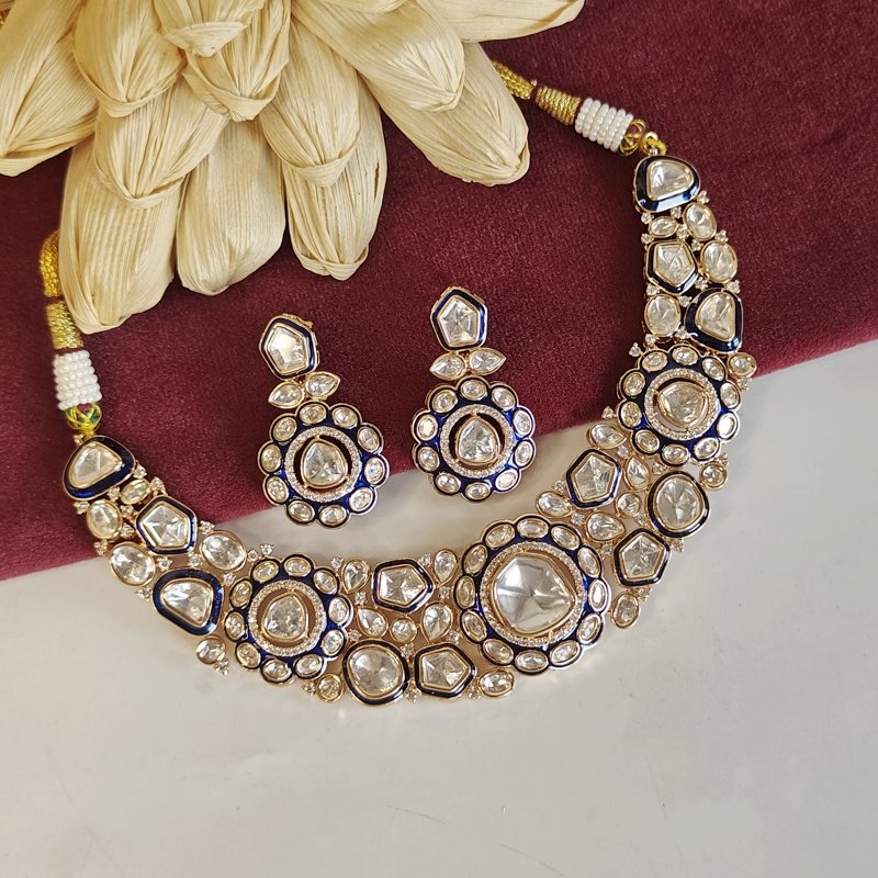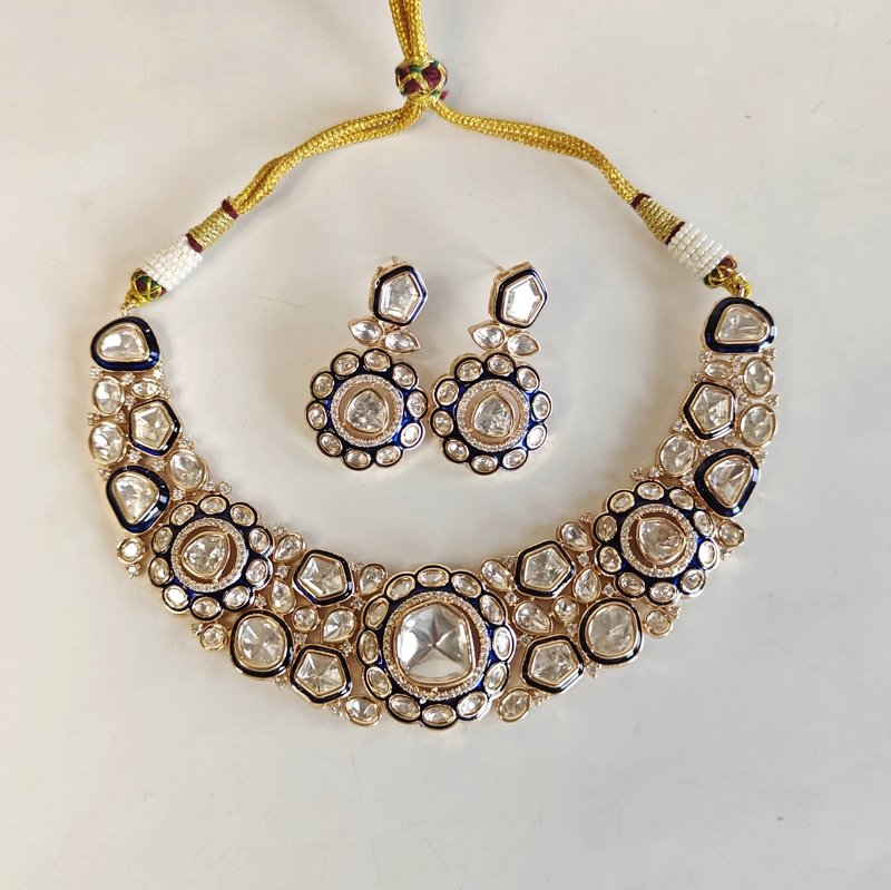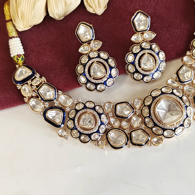 A beautiful neckline set adorned with silver Polki and blue meenakari on sides, making it an statement piece.