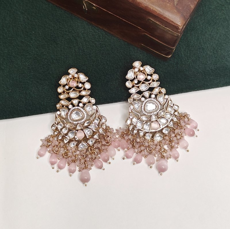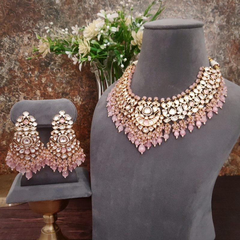 Crafted with precision and elegance, Riwayat is a divine necklace set made of gorgeous uncut artificial polki and embellished with exquisite two-tone baby pink drops beads. The set comes with stunning danglers that will dangle beautifully from your ears. It is a perfect masterpiece that has been plated with 18 karat gold for a brilliant sheen. This magnificent set is a must-have in your jewelry collection