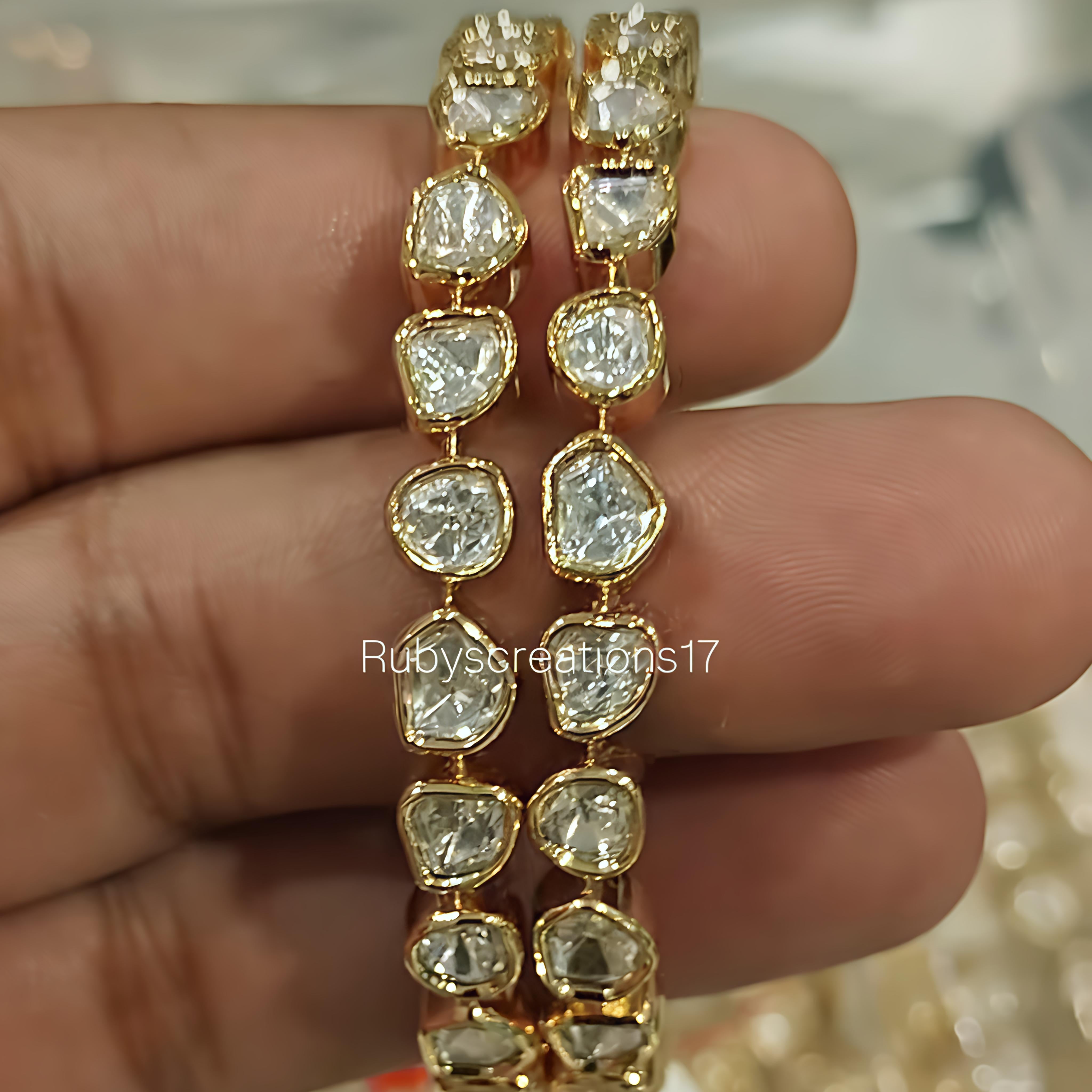 Elegant uncut silver foil Polki bangles crafted in an 18 kt gold-plated mixed metal alloy. These bangles radiate timeless charm and refined beauty, making them a perfect choice for both festive occasions and everyday elegance.