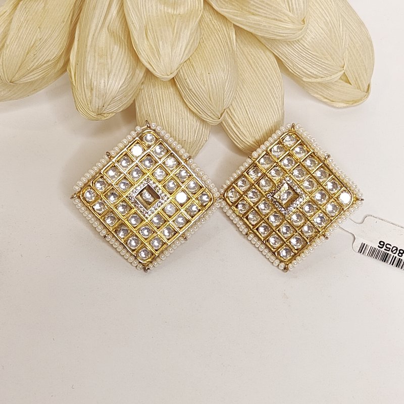 This stud features a tilted square shape design, adorned with uncut polki and cz work and edged with micro pearls on the sides.
