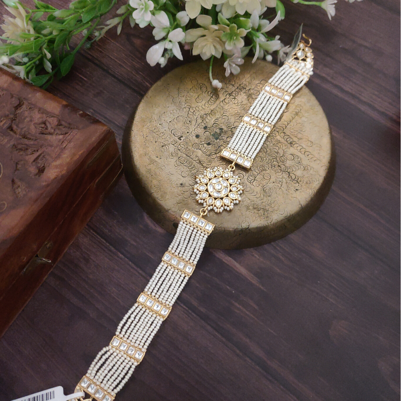 The sun-inspired design of this piece features artificial, uncut polki sheeshaptti that is layered multiple times with micro pearls. To add to its rich appeal, it has been elegantly plated in 22 karat gold.