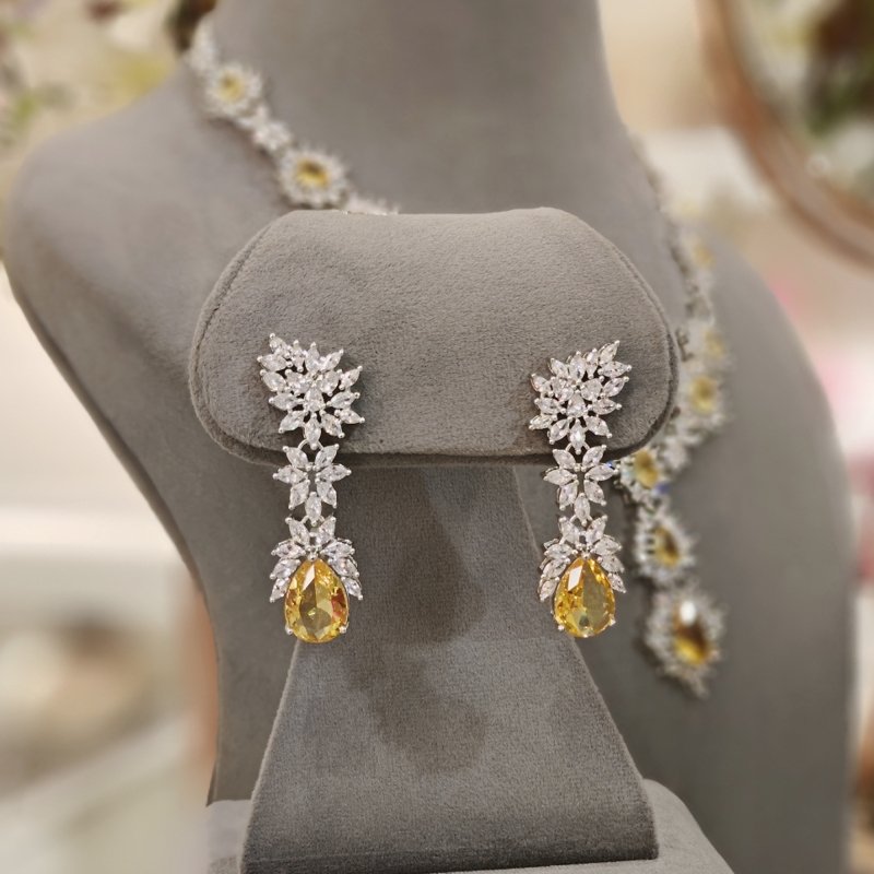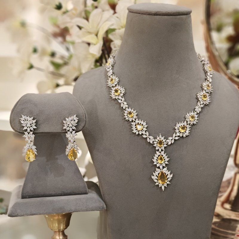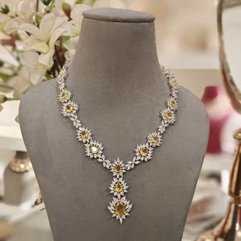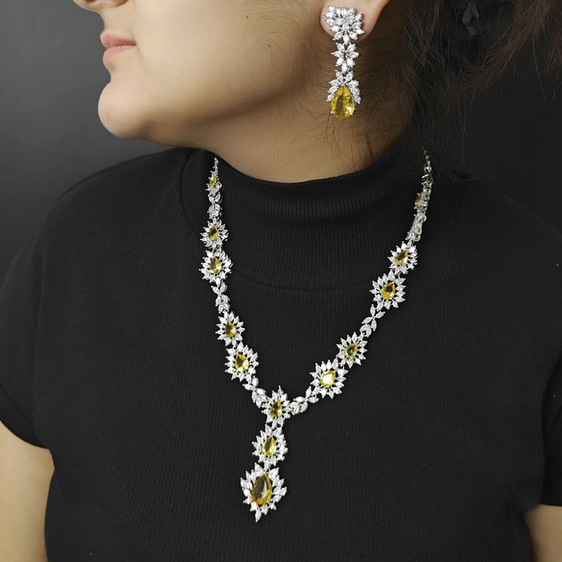 A necklace set that combines both Indian and Western influences, created with sparkly citrine coloured gems and cz stones ,plated in silver rhodium plating