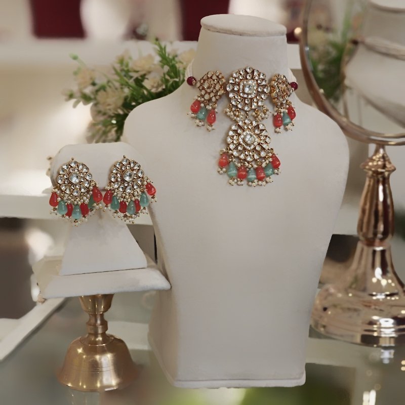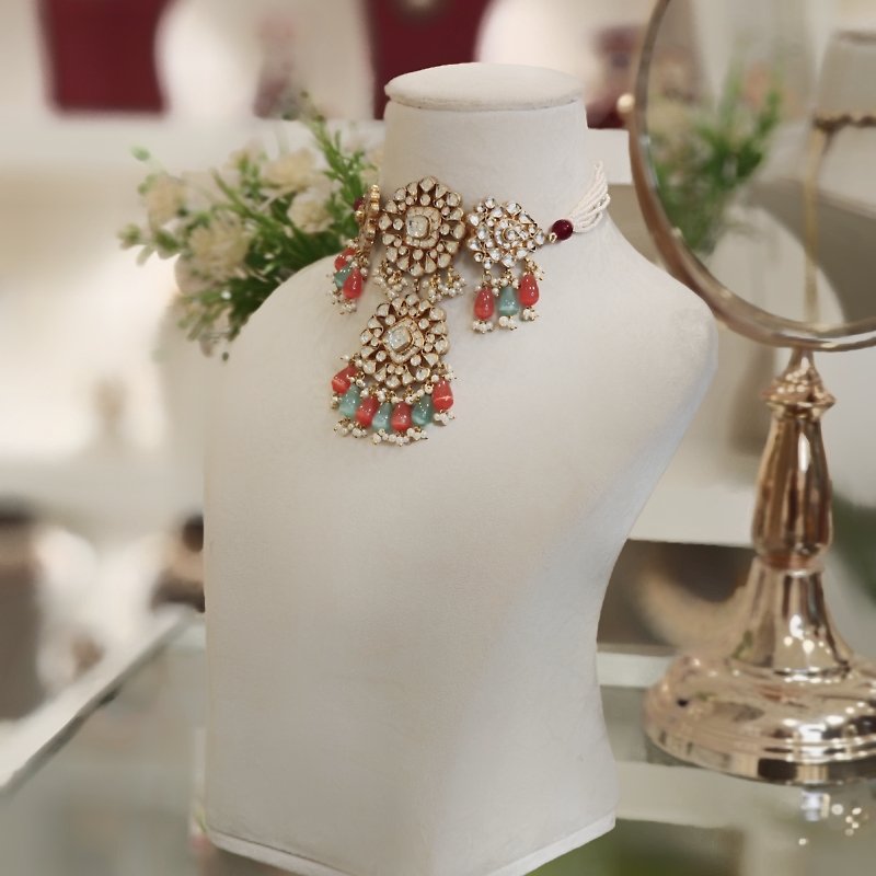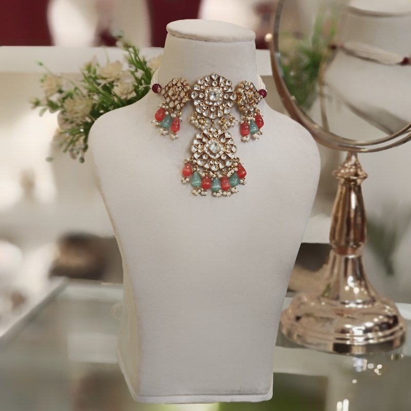 The Ruhi choker set ,plated in 22 kt gold is embellished with the finest paachi kundan and beautifully adorned with big Studs. The intricate design of the piece is further accentuated with the gorgeous combination of peach and sea green drop monalisa beads .