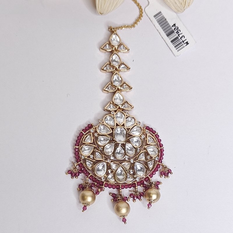 Crafted with the finest 18-karat gold plating, this maangtikka is adorned with stunning uncut artificial polki and wine coloured hydro beads with golden balls hanging at the bottom .