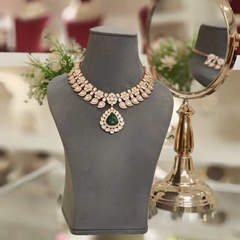 This elegant necklace set boasts a stunning design of artificial uncut polkies, coated in 22 karat gold plating. A gorgeous Green handcarved gemstone pendant takes center stage amidst the intricate detailing. The entire piece has undergone a matt polishing to achieve a timeless look.