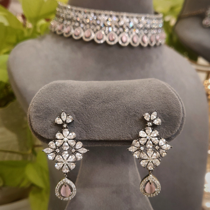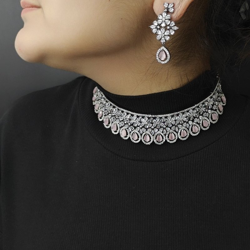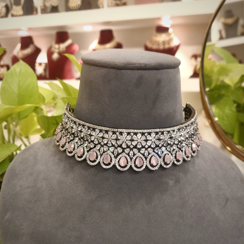 White and black rhodium plating adorn a choker set conceptualized with CZ stones and pink hydro stones. Perfect for an evening reception
