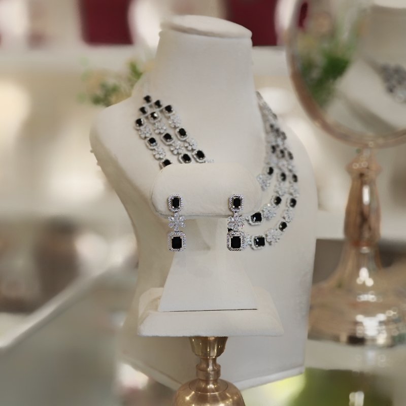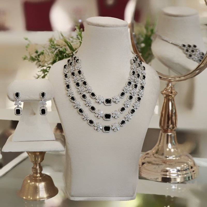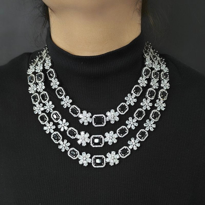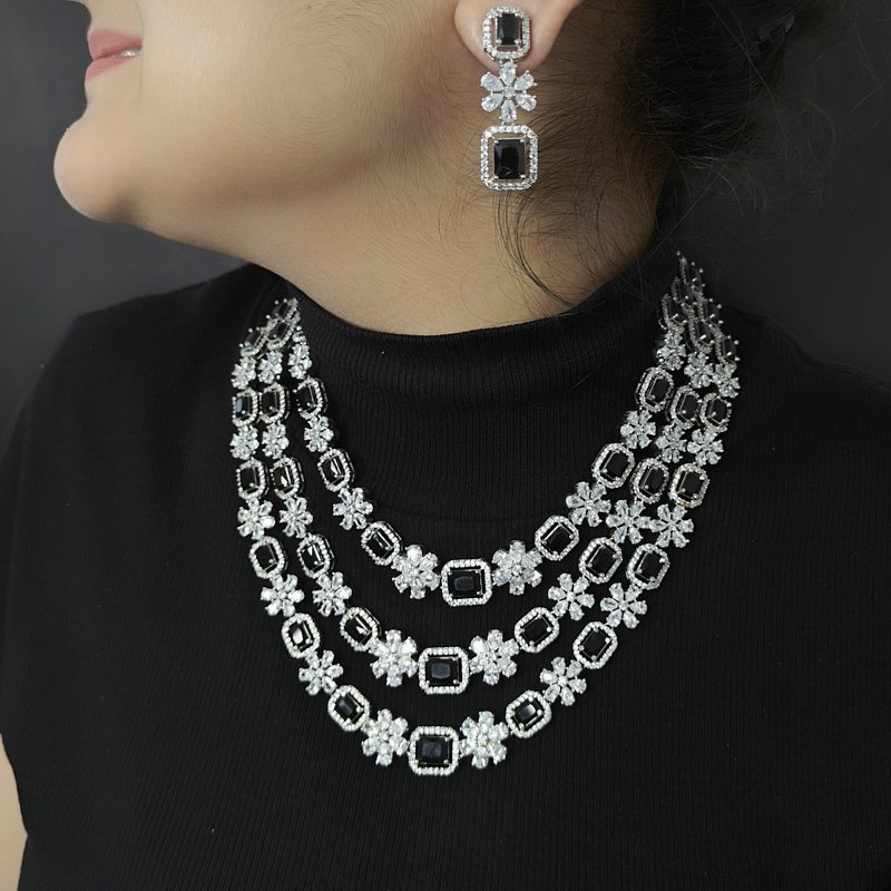 A stunning three line set featuring an Indo-Western neckline and long dangling earrings crafted with CZ and black onax stones, all coated in sleek white rhodium plating.