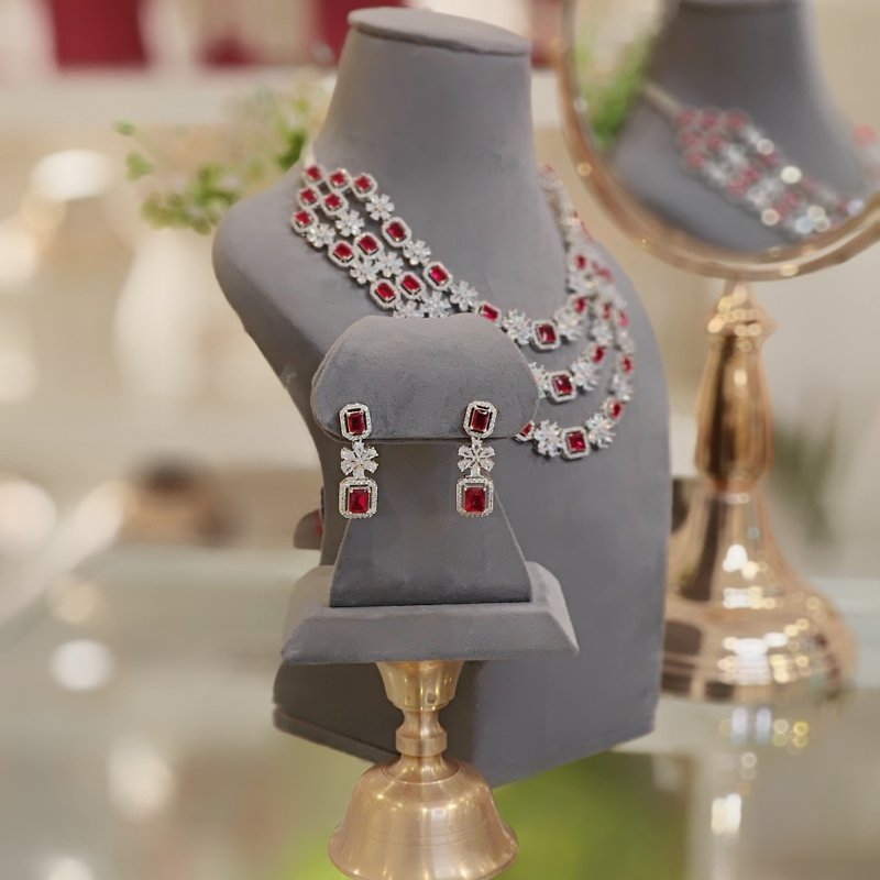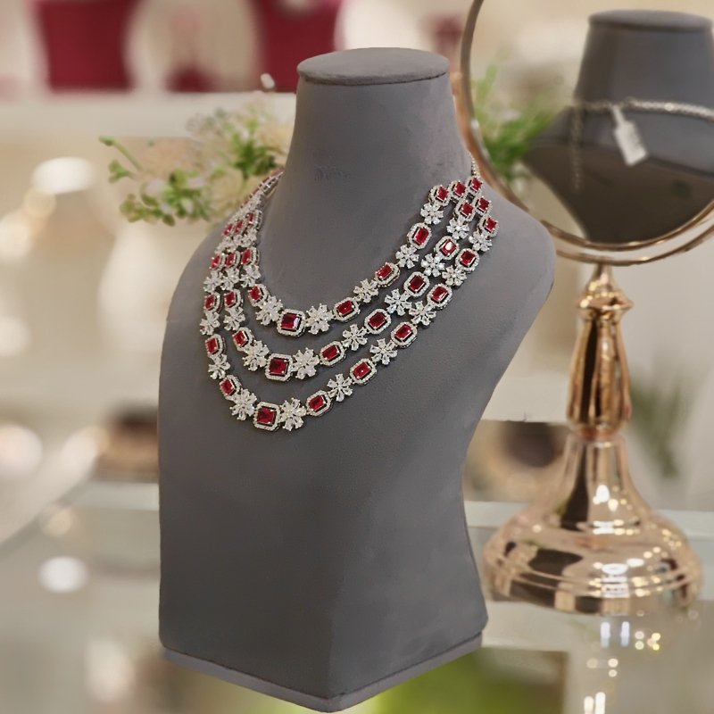 A stunning three line set featuring an Indo-Western neckline and long dangling earrings crafted with CZ and vibrant ruby red stones, all coated in sleek white rhodium plating.