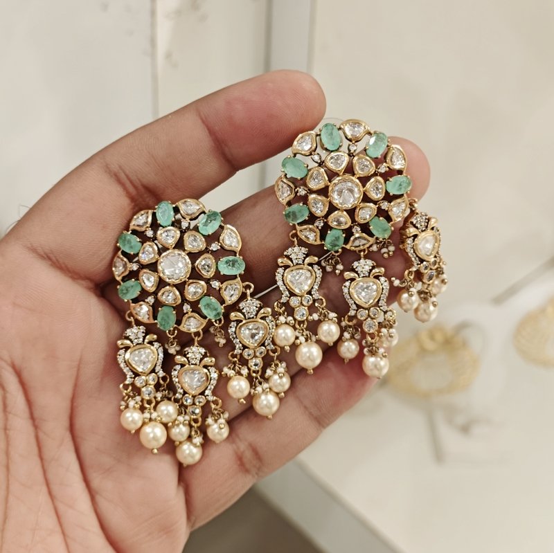 These studs are made in finest quality uncut cz polki which is real replica of diamond polki stones .Metal used is silver mixed metal alloy and plated in 22 kt gold and black rhodium polish ,beaded in white pearls and mint green doublet stones .
