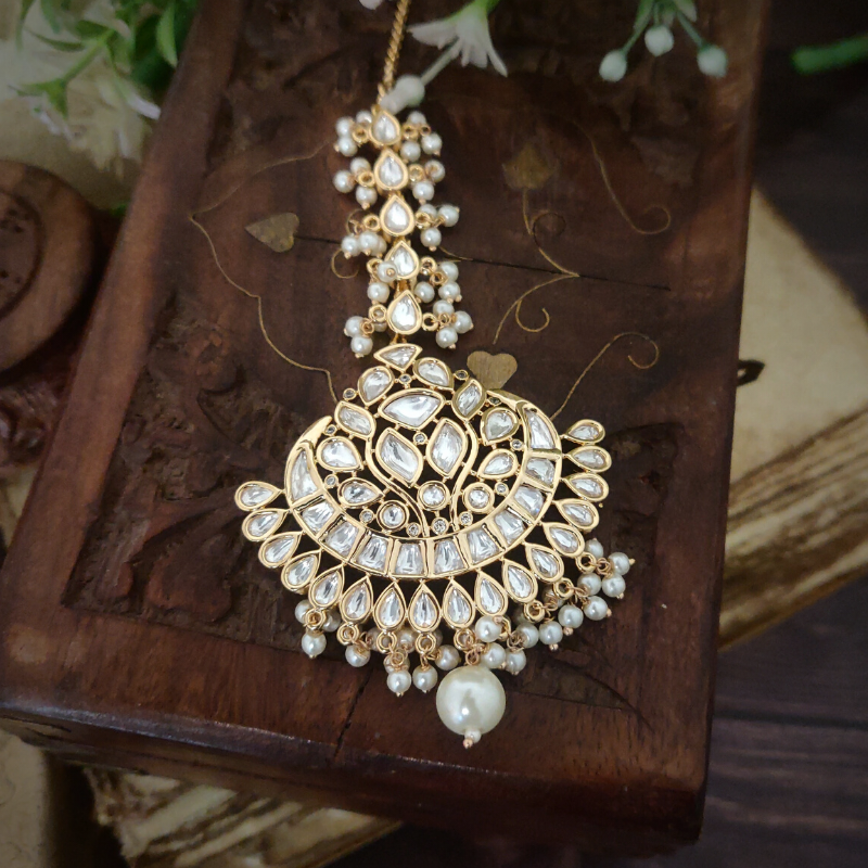 Crafted with kundan polki stones and pearls, this maangtikka is plated with 18-karat gold. The piece embodies exquisite beauty and sophistication that will undeniably captivate anyone's heart.