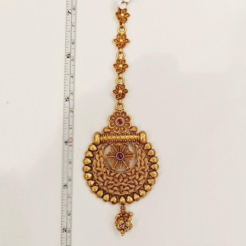 Medium sized maangtikka made in ball and die workmanship ,finished in antique gold colour.