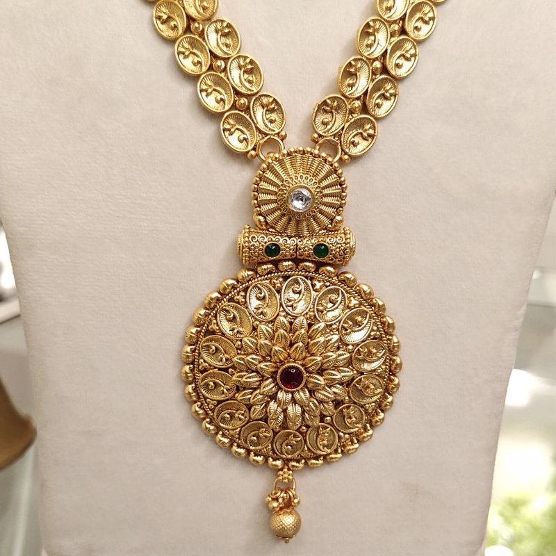 Crafted in real gold set design and enameled in ivory colour meena ,this set is plated in antique gold polish with ruby and green pota stones .