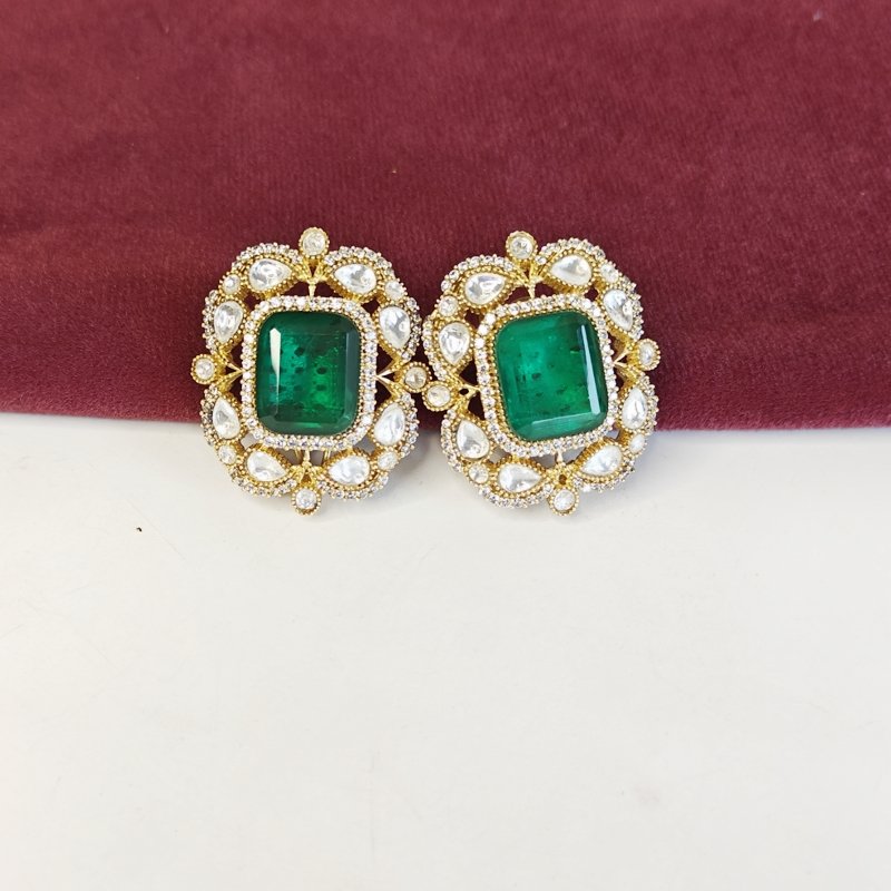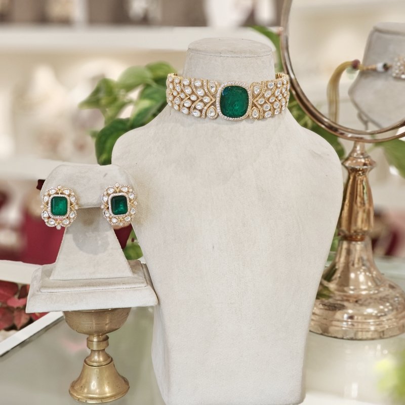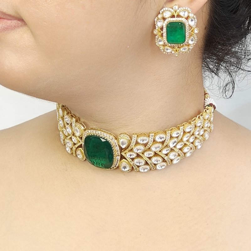 This lightweight gold-plated choker set is studded with emerald green doublet stone along with shimmering golden Moissanite polki, surrounded by sparkling CZ stones. Its delicate design makes it a beautiful and versatile piece, perfect for adding elegance to any occasion while offering both comfort and style.